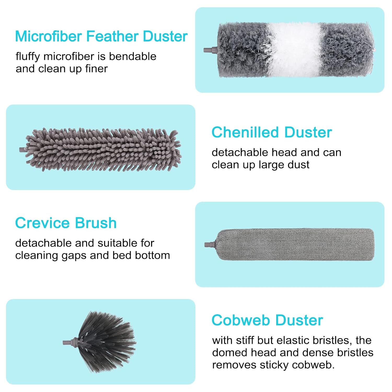 - โ 12 PCS Feather Duster Kit: This microfiber hand duster set includes 2m Telescopic Pole, 1 Bendable Microfiber Duster Head, 2 Chenille Duster Head, 1 Cobweb Duster Head and 2 Crevice Brush, 1 blinds duster, 1 Microfiber Cleaning Cloth and 2 5in short handle, A pair of grey gloves. Replacing different types of duster brush heads can handle different cleaning scenarios, keeping your home away from dust.