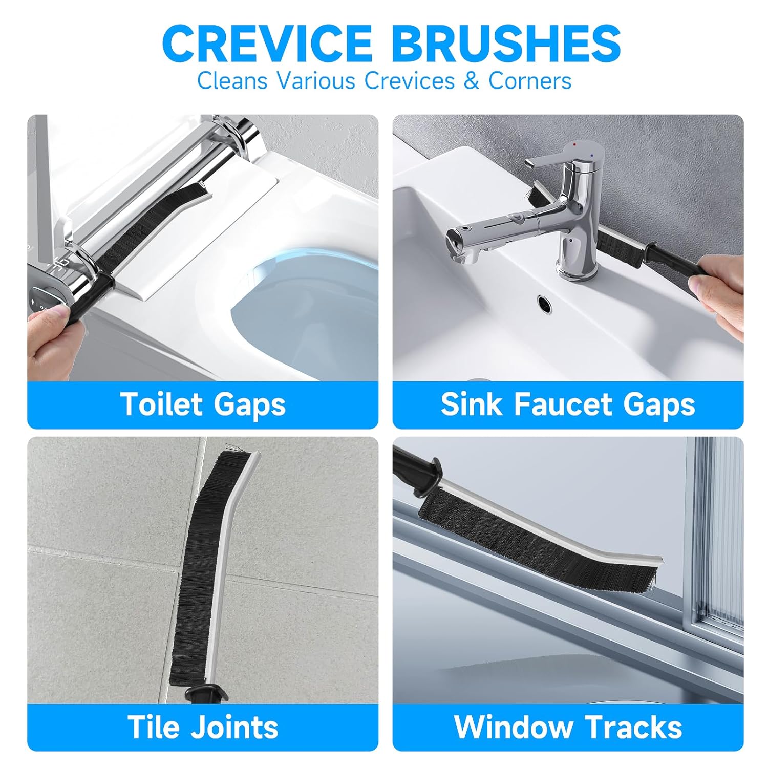 - GREAT CLEANING ACCESSORIES: Do you struggle with various hard to clean corners in your home? 14pcs crevice cleaning brush set can help you solve the problem easily. This complete cleaning solution includes 2 V-shaped grout cleaner brushes for tile grout, 5 crevice brushes for tight spaces, 2 triangle cleaning brush for bottles, 2 scrapers for quick wipe-downs, and 3 wire brushes for stubborn stains.