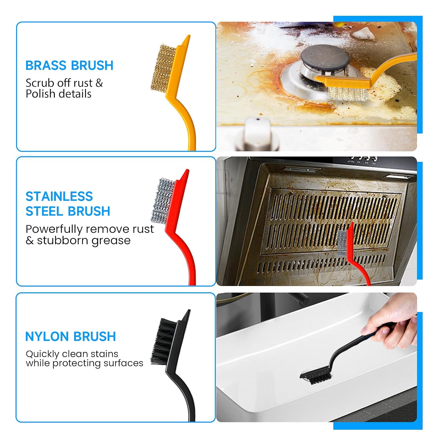 - PROTECT YOUR HOME: This gap cleaning set features specially designed brushes with different bristle materials to safely clean all surfaces without damage. The grout, crevice and triangle brushes gently clean hard surfaces like tiles, floors, sinks and bathtubs without scratching, while brass brush polish metal surfaces, stainless steel brush remove rust, and nylon brush for delicate surfaces.