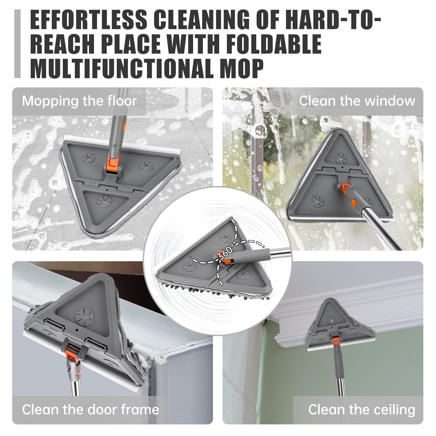 - [Wall Mop Cleaner with Long Handle]: The wall mop cleaner with squeegee and a 90° flipped panel, which is ideal for cleaning floors, walls, windows, and ceilings. Its slim and flat design allows it to clean behind furniture and appliances. It includes 4 reusable mop pads that fasten with Velcro for dry or wet use