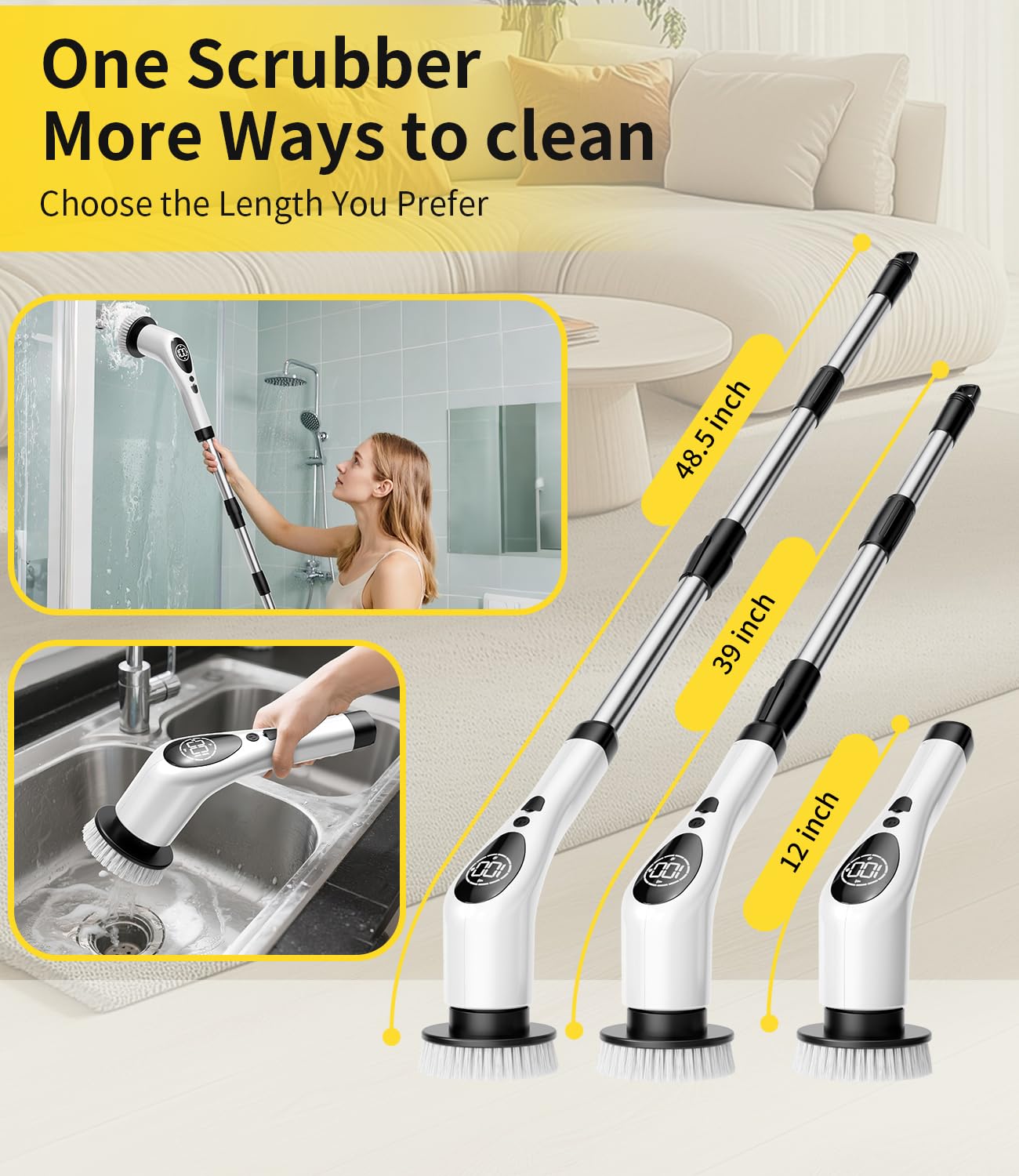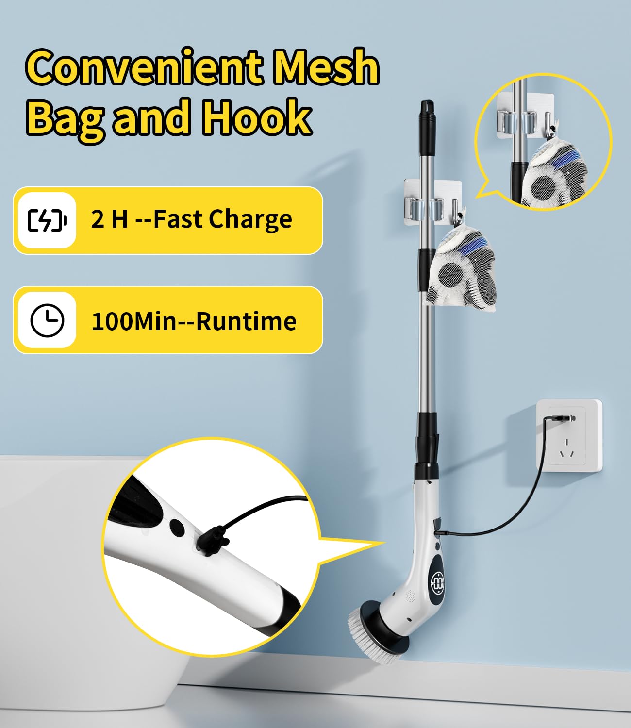 - Convenient Design-Easy to Assemble: The bathroom scrubber is adjustable & detachable extension handle, can be long handle adopts 3- section design,Retractable Tube adjust from 11.5 to 48.5 inches,helps you do housework with the most relaxed posture. Different from traditional hand wash. without bending over and making your cleaning work less tiring.Plus, the package includes charging cables, a storage bag,and a hook for convenient storage.