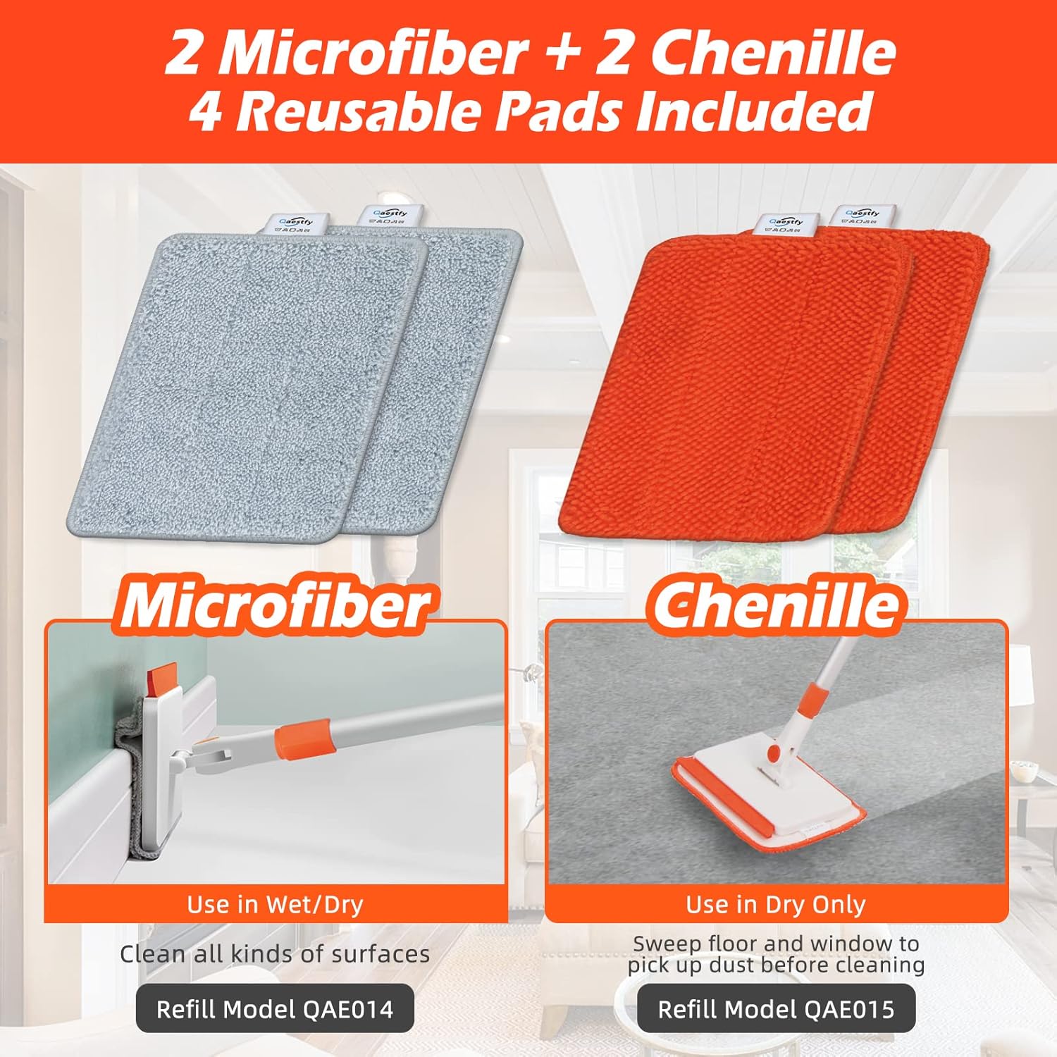 - 【Replaceable and Machine-washable】Mop pads are available. The microfiber replacement head model is designated QAE014; the chenille pad model is designated QAE015