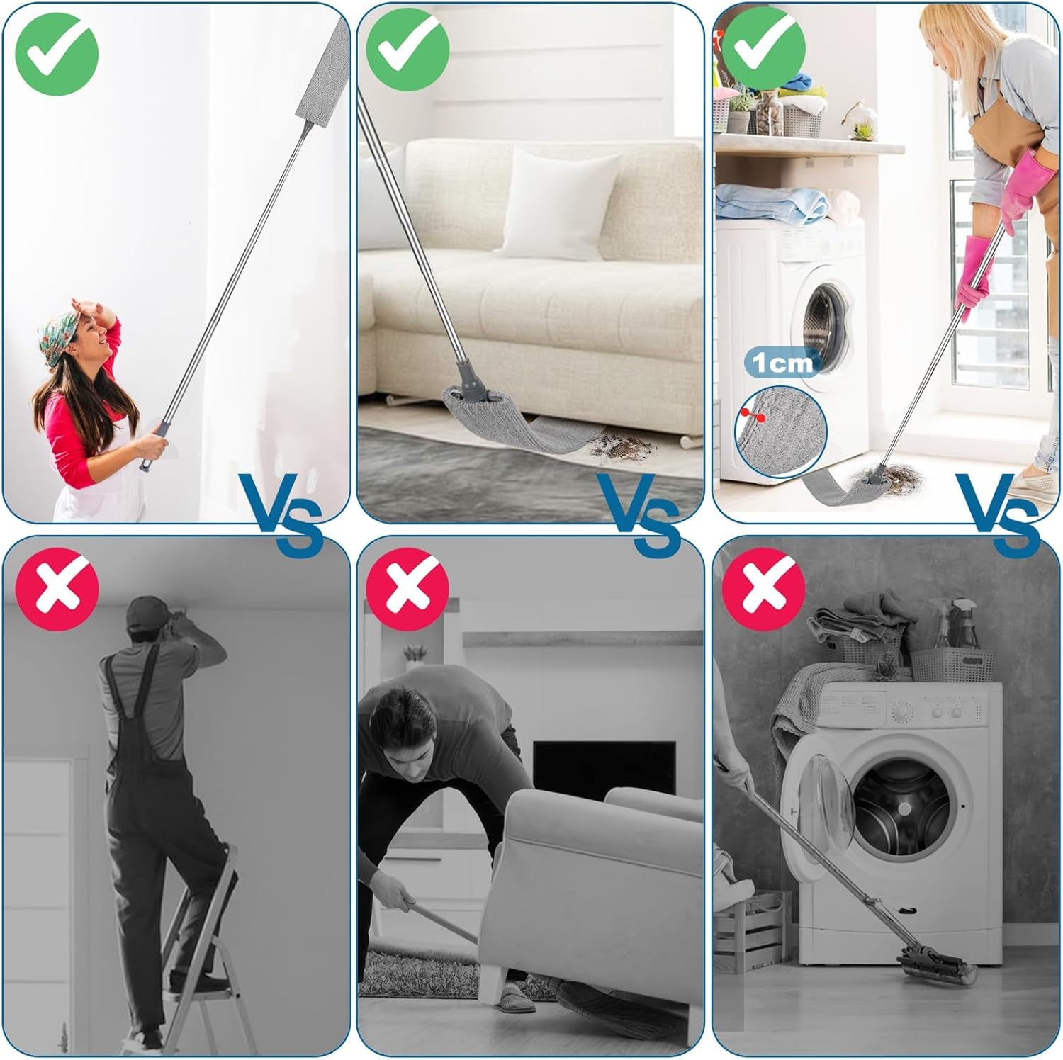 Works wells to clean under the fridge, sturdy for purpose, reach far and fit with no problem, super easy to use and clean with, I can even clean the celing now.