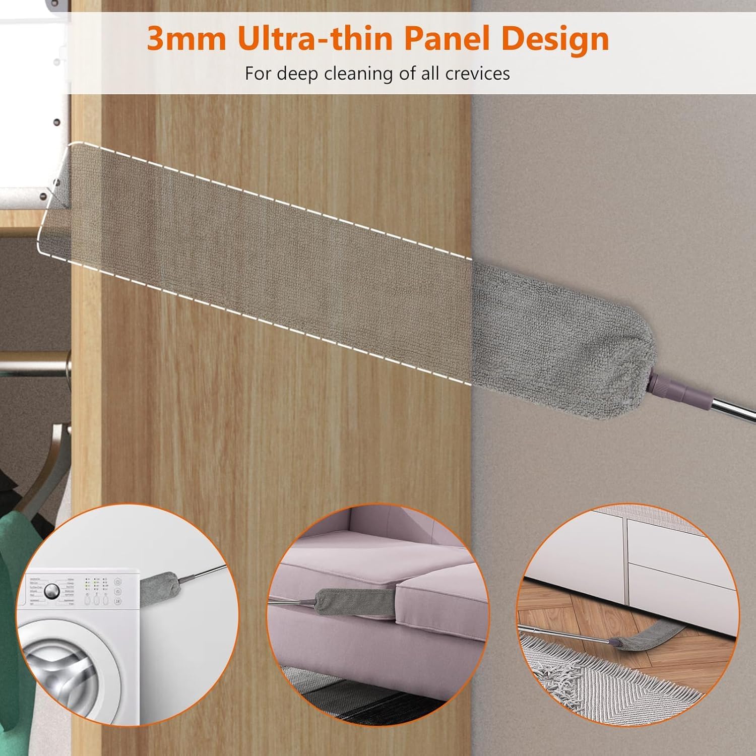 - ใFlexible Head for Hard-to-Reach CleaningใThe duster features a bendable head that adapts to narrow gaps and tight corners, such as under appliances, behind furniture, between blinds, and inside car vents. This design enables deep cleaning in typically challenging areas, making it an essential tool for thorough home and car care.