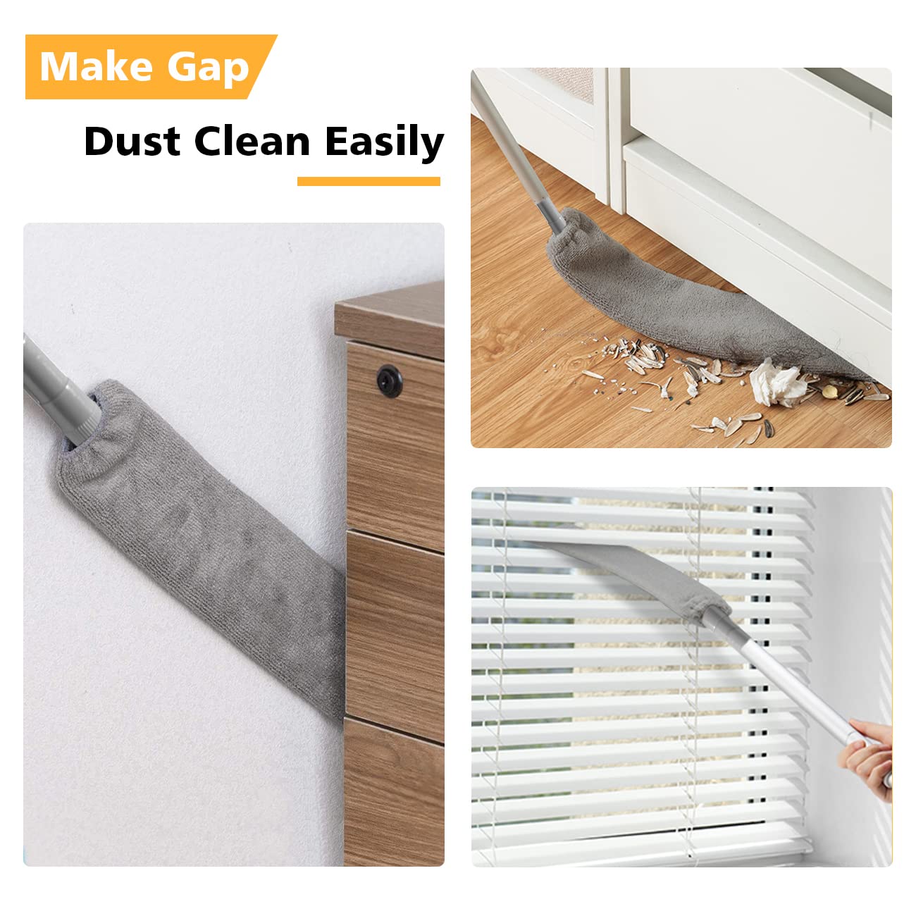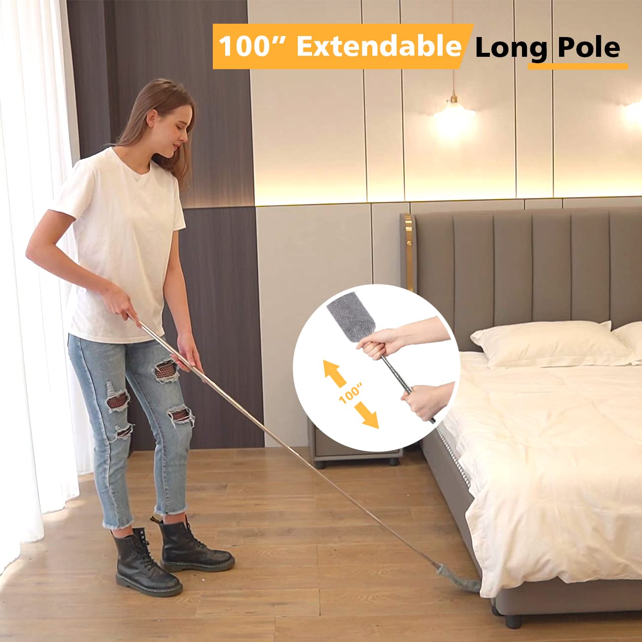 - 【100” Extendable Long Pole】The upgraded stainless steel long pole is more sturdy and won’t rotate. Attached to the gap duster, it can extend from 31 inch to 100 inch, help you clean dust under appliance easily.
