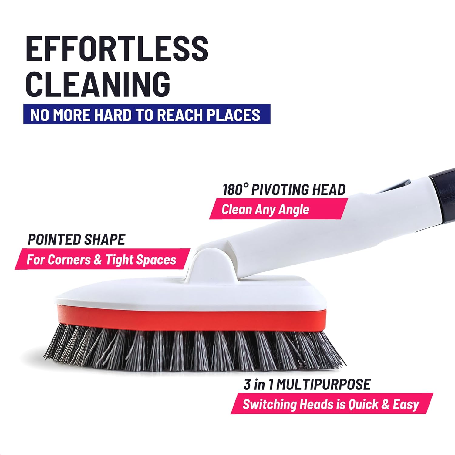 - 3-IN-1 MULTIPURPOSE CLEANING — The 3-in-1 tub tile scrubber brush attachments enable non-scratch cleaning of all surfaces, including Porcelain, Ceramic, Cast Iron, Marble, Mosaic, Fiberglass, Acrylic, Vinyl, Plastic, Wood, Stainless Steel, Brass, Zinc and Glass