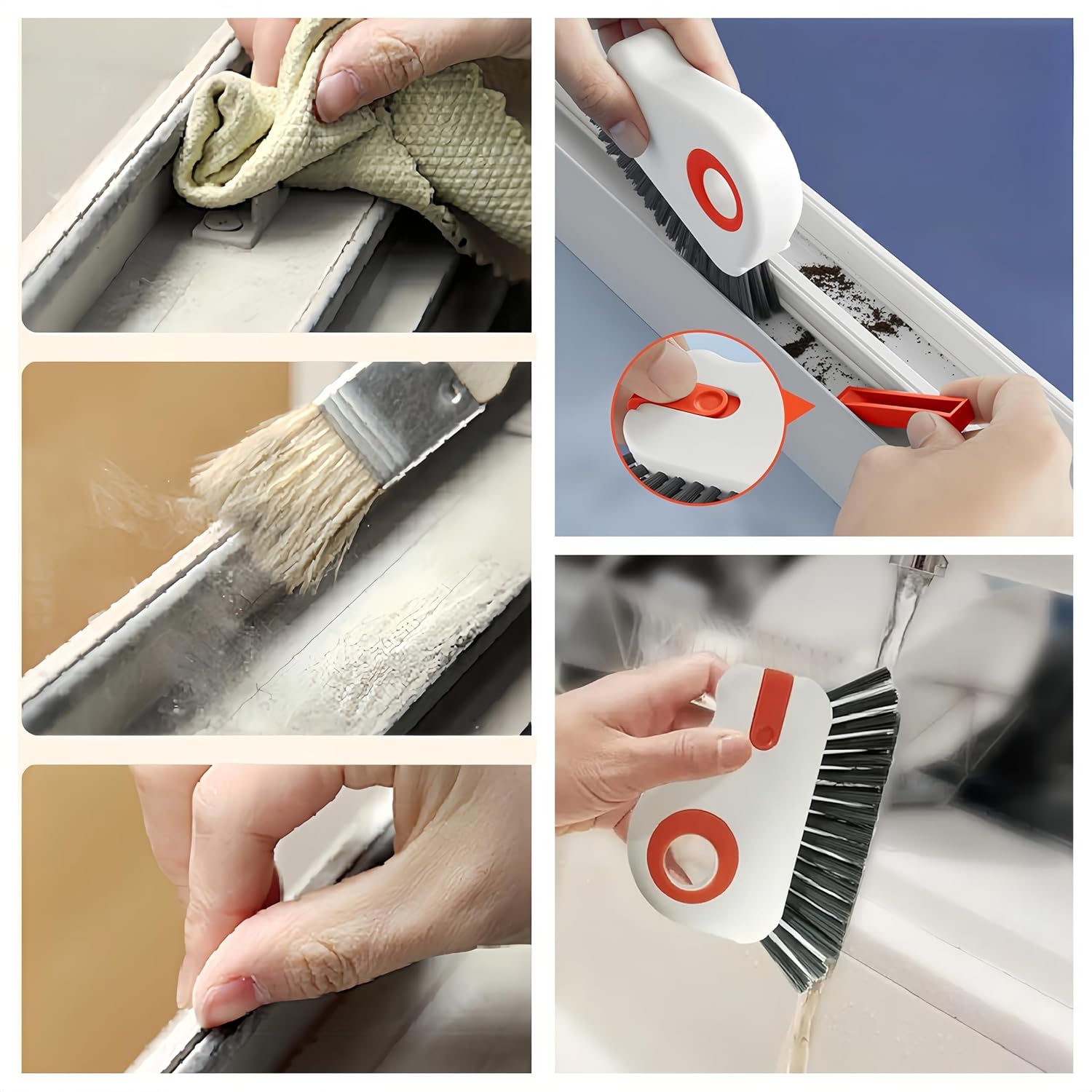 - 1.ใ2 in 1 Design window groove cleaning brushใ: Our window cleaning tool has a built-in scraper in slot in the handle. This hard scraper can remove grime that accumulate over time and small fluted dustpan design can collect scraped dirt tool for cleaning sliding door track