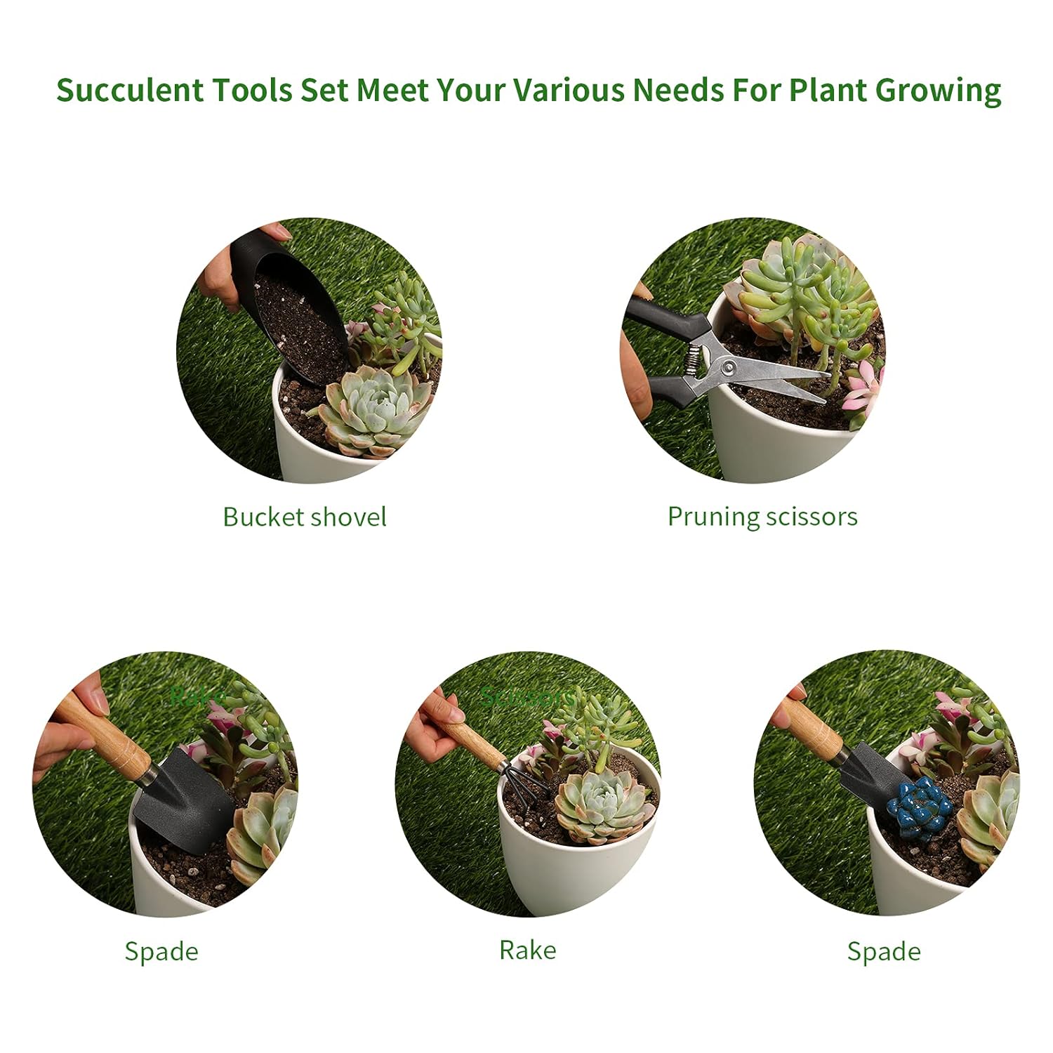 - [SUCCULENT GARDEN TOOLS SET] The mini gardening hand tools kit include 3Pcs garden planting tools:1 shovel,1 spade,1 rake;and1 pruning scissors; 1 plastic bucket shovel,pieces of 5.