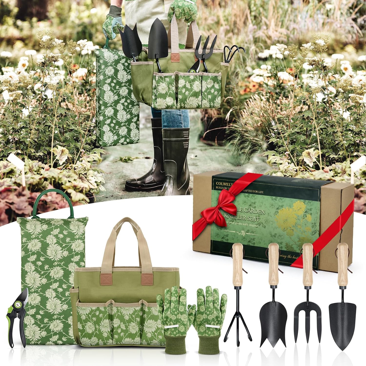 Colwelt Garden Tools Set, 8 Piece, Heavy Duty Gardening Tools with Wooden Handle, Including Garden Tote, Kneeling Pad, Gloves, Pruner, Trowel, Tulip Trowel, Cultivator – Gardening Gifts For Women Men