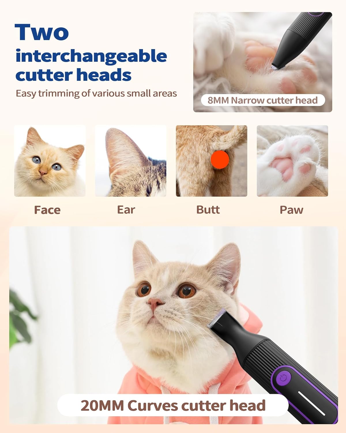- [Includes 2500 mAh Dog Hair Clippers & 800 mAh Dog Paw Trimmer] 2500 mAh thick coat dog clippers lasts up to 300 minutes for trimming more than three dogs. PAPMINI pet grooming kit also includes dog hair trimmer which is specially designed for trimming small areas such as paws, ears, eyes, face and butt. The Dog Paw Trimmer includes two different sizes of trimming heads that can be replaced as needed for easier trimming of your dog