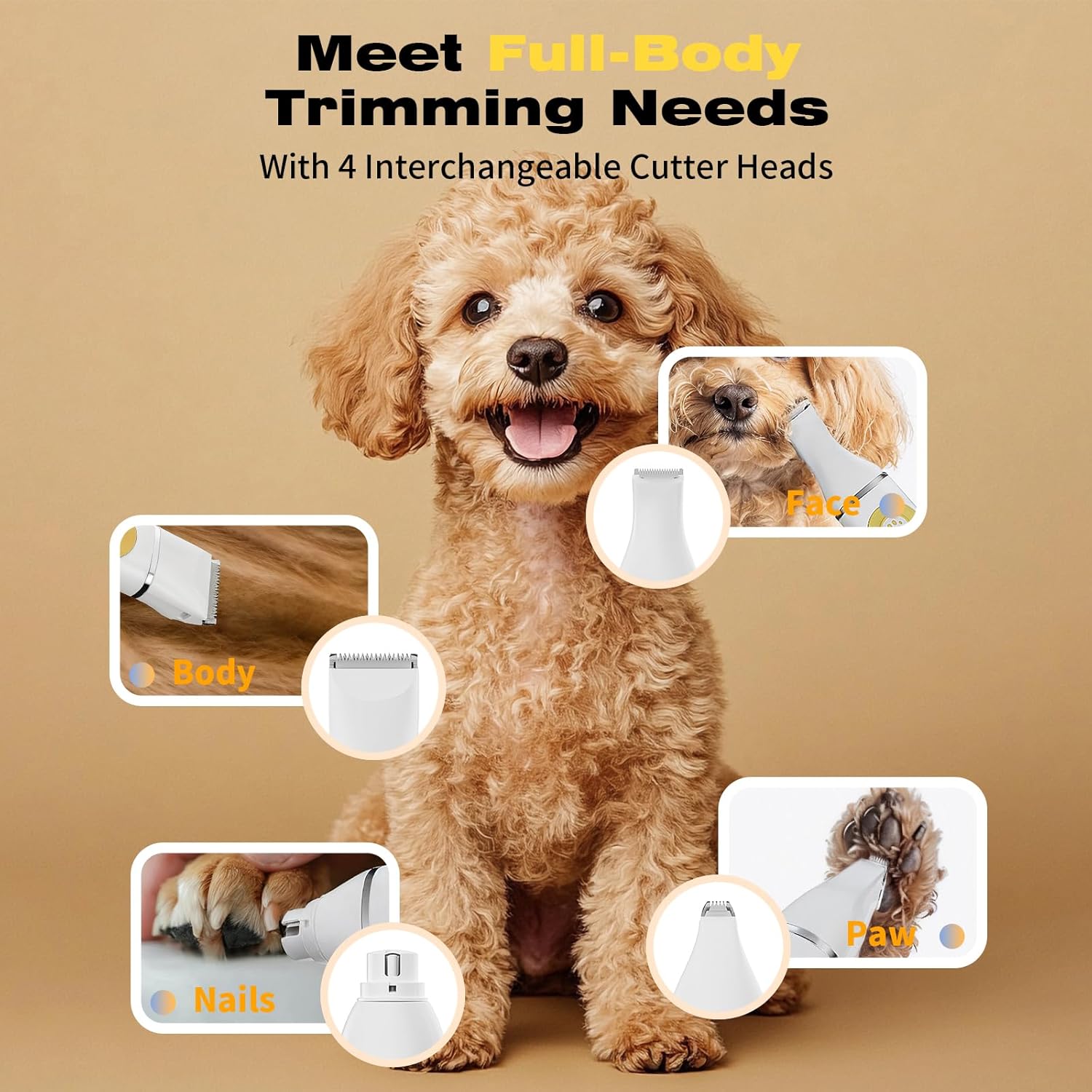 - ใ4-in-1 Professional Grooming Kitใ Complete your pet care routine with 3 trimming heads (face/paw/body) + 1 nail grinder head. Perfect for dog & cat owners seeking all-in-one grooming solutions at home. Easily switch between tools for full-body clipping and nail polishing.