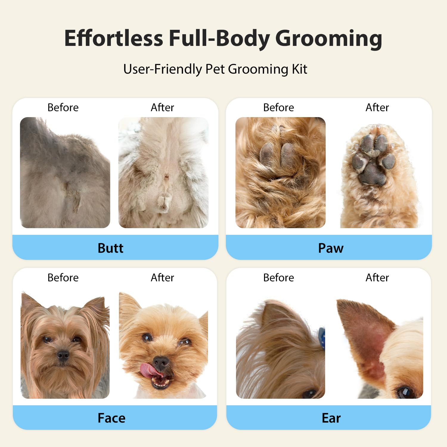 - 【All-in-One Grooming Kit】Includes 2 clippers for large-area grooming and precise trimming (ears, paws, face, butt, etc.), along with multiple heads and 8 guide combs for different hair lengths, ensuring professional grooming for pets of all coat types.