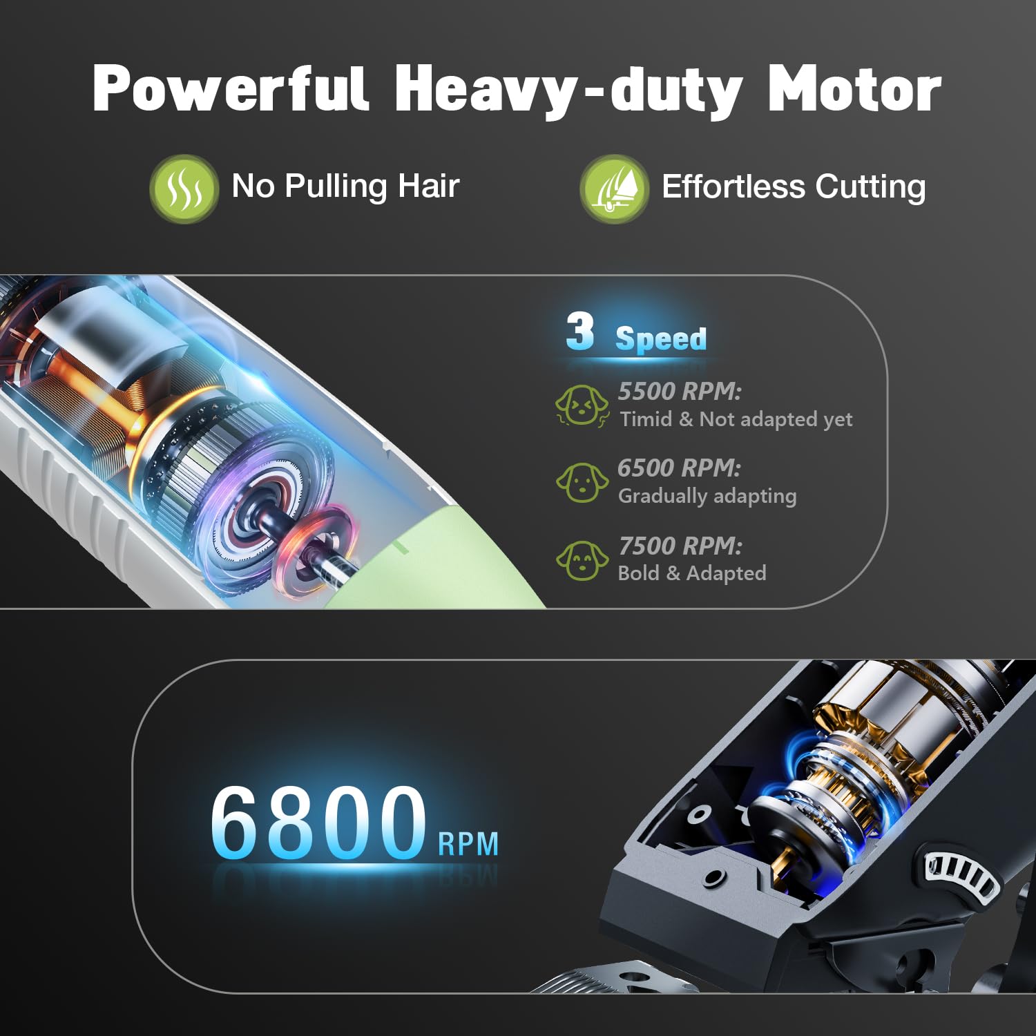- ใEfficient, Low-Noise Design โ Stress-Free GroomingใEquipped with a low-noise motor operating at just 55dB, keeping pets calm and relaxed. The 6800 RPM motor is optimized for thick coats, minimizing hair-pulling and reducing grooming time by 45%.