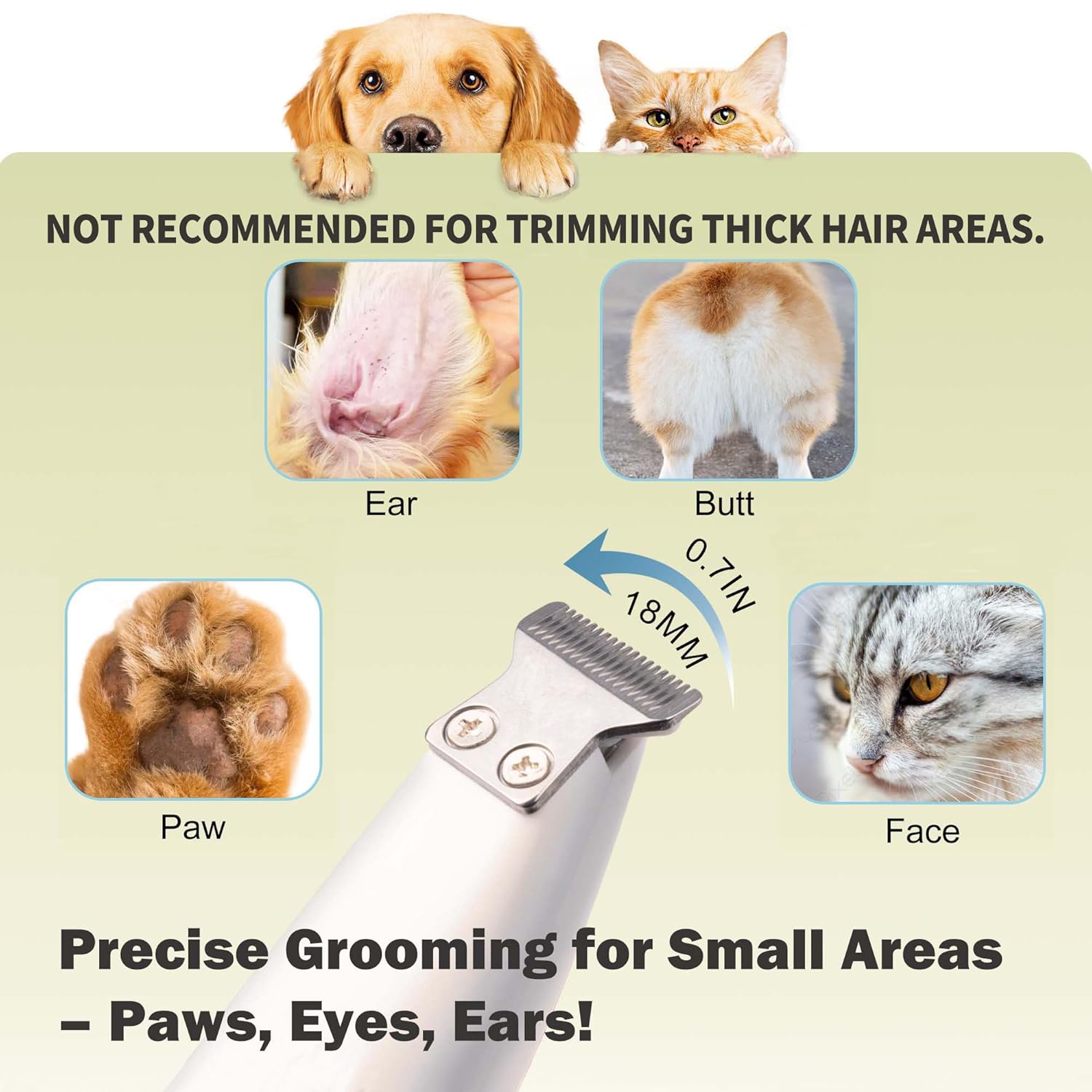 - Dog Clipper for Precision Grooming: Equipped with 18mm wide blades, this dog paw trimmer is designed for precise and effective grooming of small areas such as paws, eyes, ears, face, and rump. Ideal for both dogs and cats, the blade ensures safe trimming in sensitive areas, perfect for precise grooming.