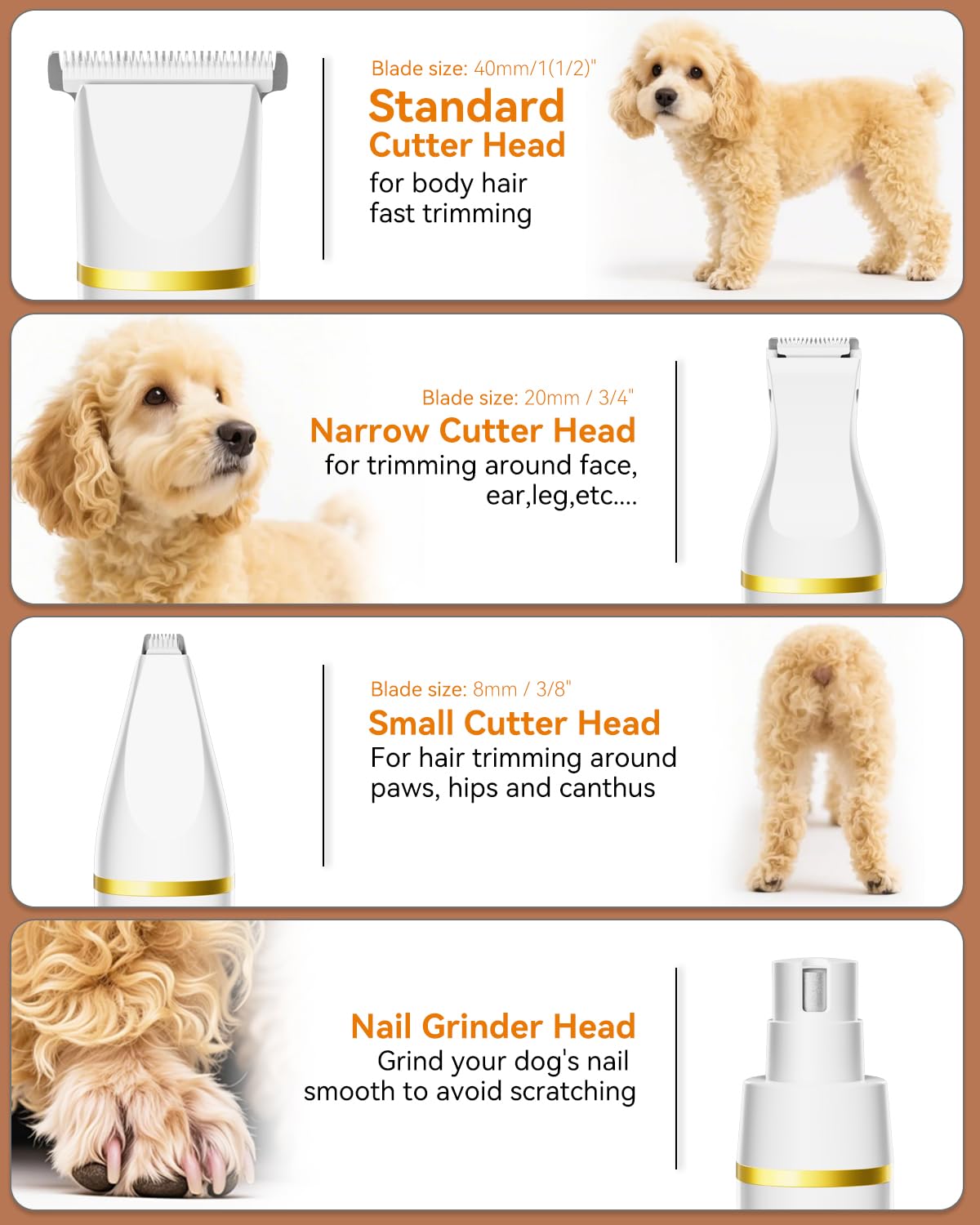 - The Same Money to Get Four: The 7116 dog and cat grooming kit adopts a detachable cutter head design with 4 replaceable cutter head attachments — standard cutter head,narrow cutter head,small(details) cutter head and nail grinder head, which can be quickly replaced with just one pull and one push to meet the needs of dog and cat body trimming. Save your money now!