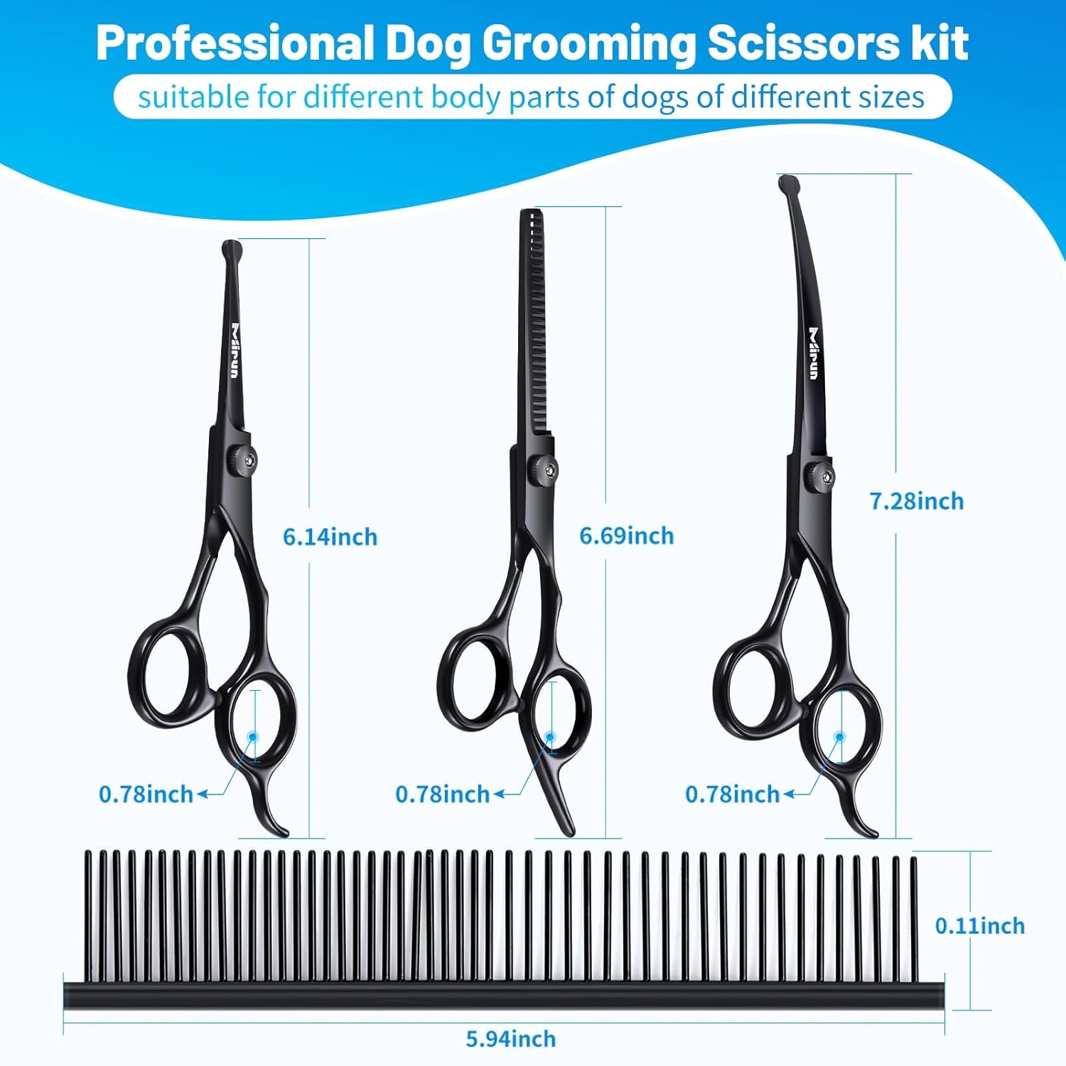 - 5-In-1 Dog Grooming Kit — The dog grooming scissors come with 1 straight scissor, 1 thinning scissor, 1 curved scissor, 1 grooming comb, 1 cleaning cloth and 1 storage case. Necessary dog scissors for grooming face and paws.