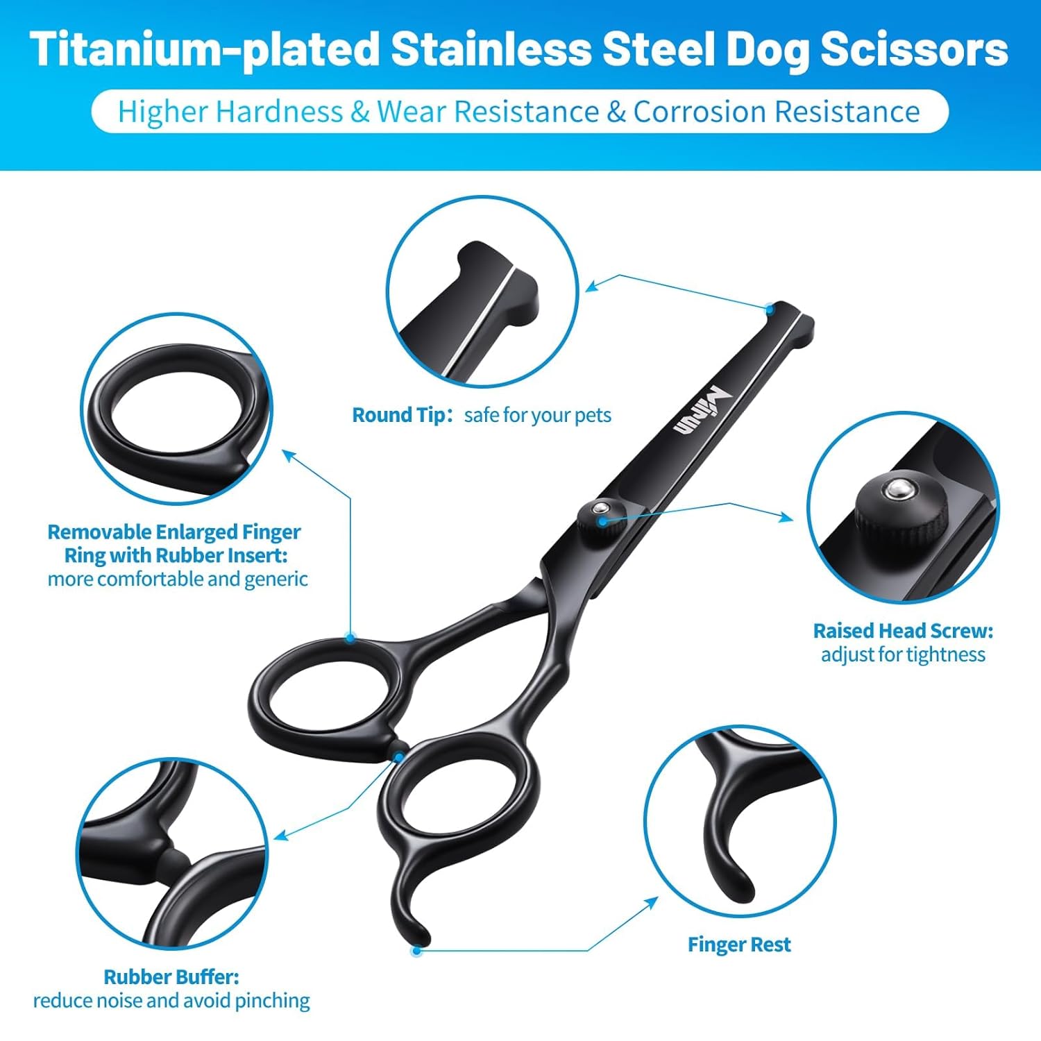 - Professional Dog Grooming Scissors for Dogs — The dog scissors for grooming are made by high-quality titanium-plated stainless steel with higher hardness, wear resistance and corrosion resistance. The dog grooming scissors professional are so durable and sharp that whether it is thicker hair or tangled hair, it can be easily cut. No snagging or pulling with our pet grooming scissors.