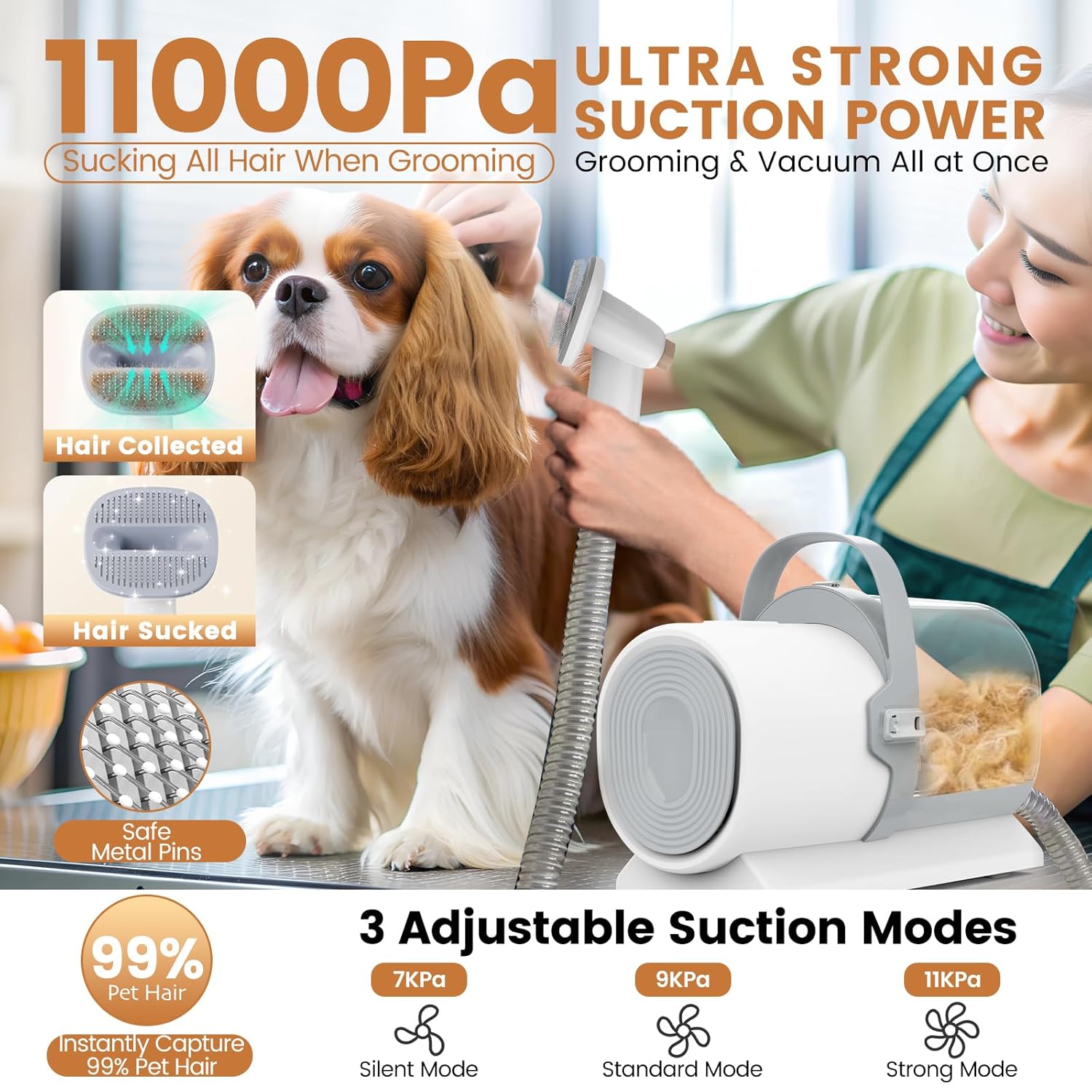 - Grooming & Vacuuming All At Once: Our dog grooming vacuum with vacuum suction, equipped with 11000pa powerful suction special heads and HEPA filter captures 99% of floating hairs and tiny particles when grooming pet hair without worrying about cleanup afterward, which is very helpful in maintaining indoor air quality. Say goodbye to hair-covered furniture and floors