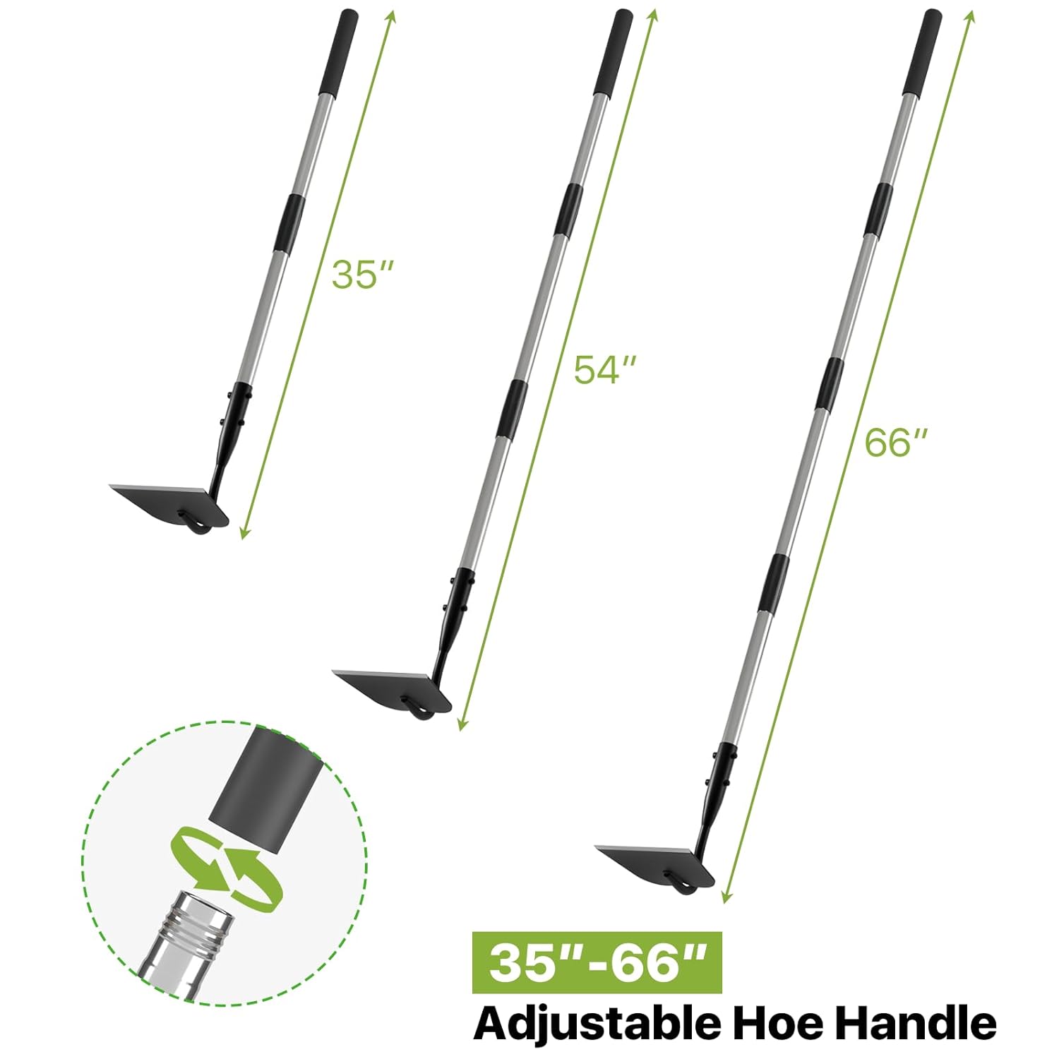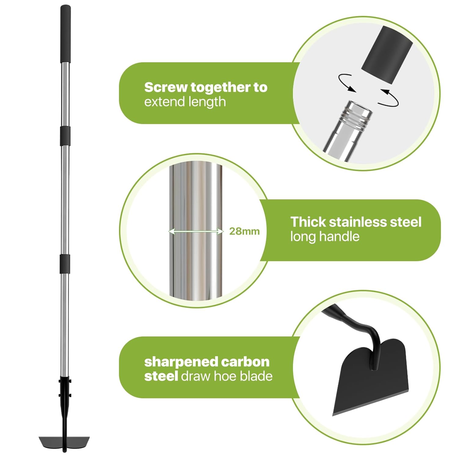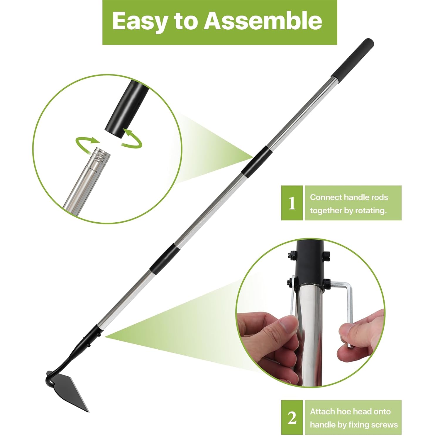 - Easy to Assemble: This garden hoe is designed with multi-section poles that can be easily assembled by screwing them together and tightening. The forged hoe head is riveted all the way through the handle using a double bolt and nut structure, which makes it more durable and prevents the hoe head from loosening.