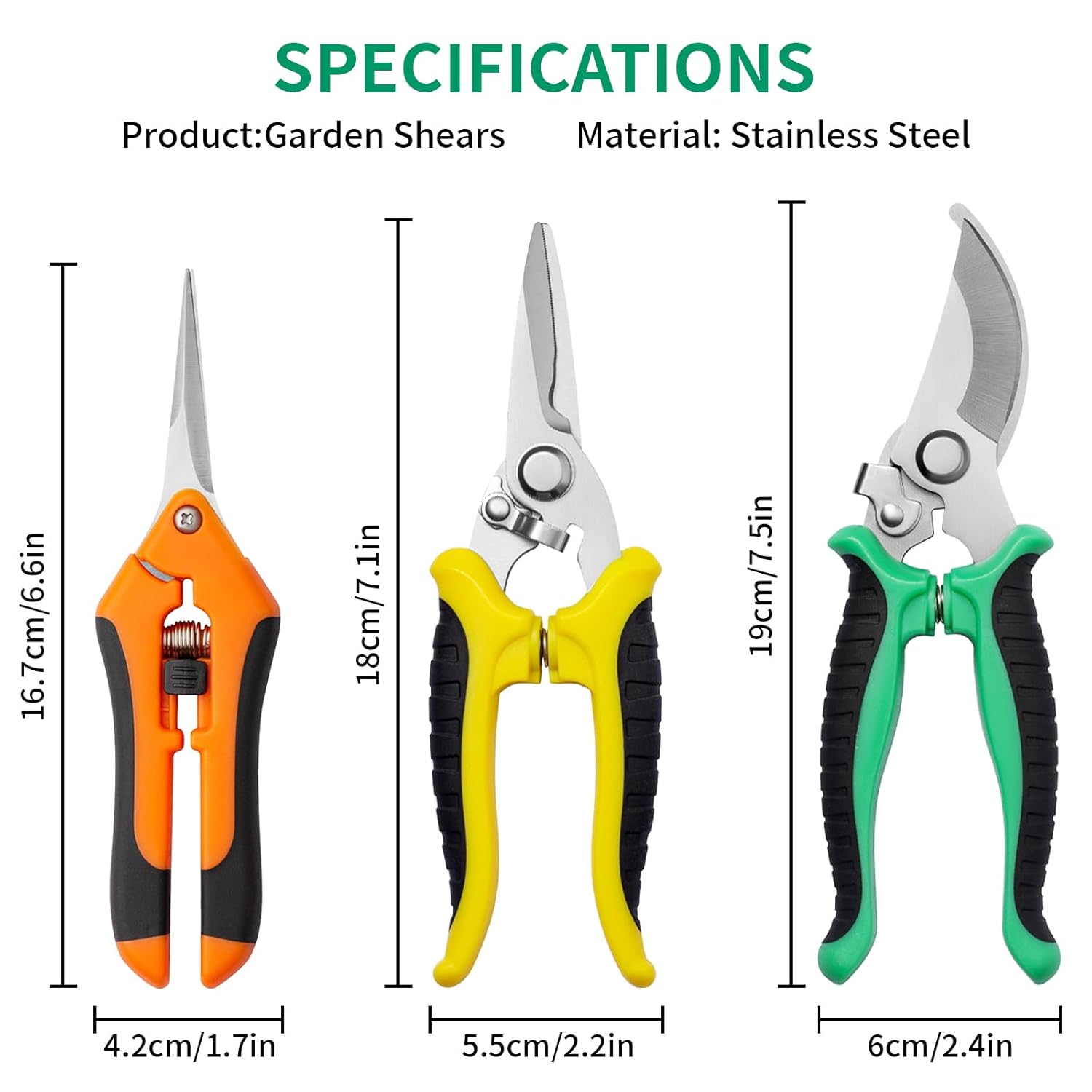 versatile and budget-friendly set for gardening enthusiasts. Each pair of shears is designed for a specific task, offering a mix of precision and durability for pruning, trimming, and shaping plants. The ergonomic handles ensure a comfortable grip, even during prolonged use, and the sharp blades make cutting through stems and branches smooth and efficient. The set is lightweight and easy to handle, making it ideal for beginners and experienced gardeners alike. While they perform well for light to medium tasks, heavy-duty pruning might require more robust tools