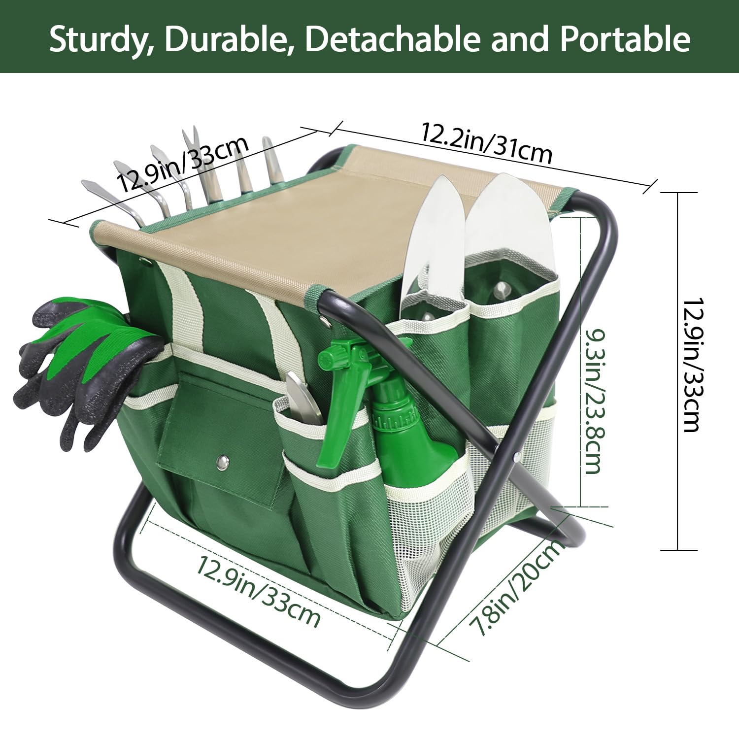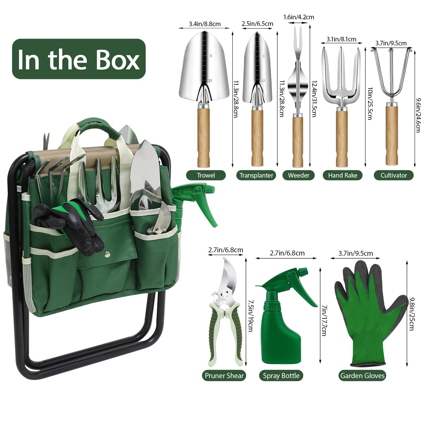 About Garden Tool Set, 10 Piece Kit with Heavy Duty Folding Stool, Detachable Storage Tote Bag, Stainless Steel Tools, Gifts for Women Men Green