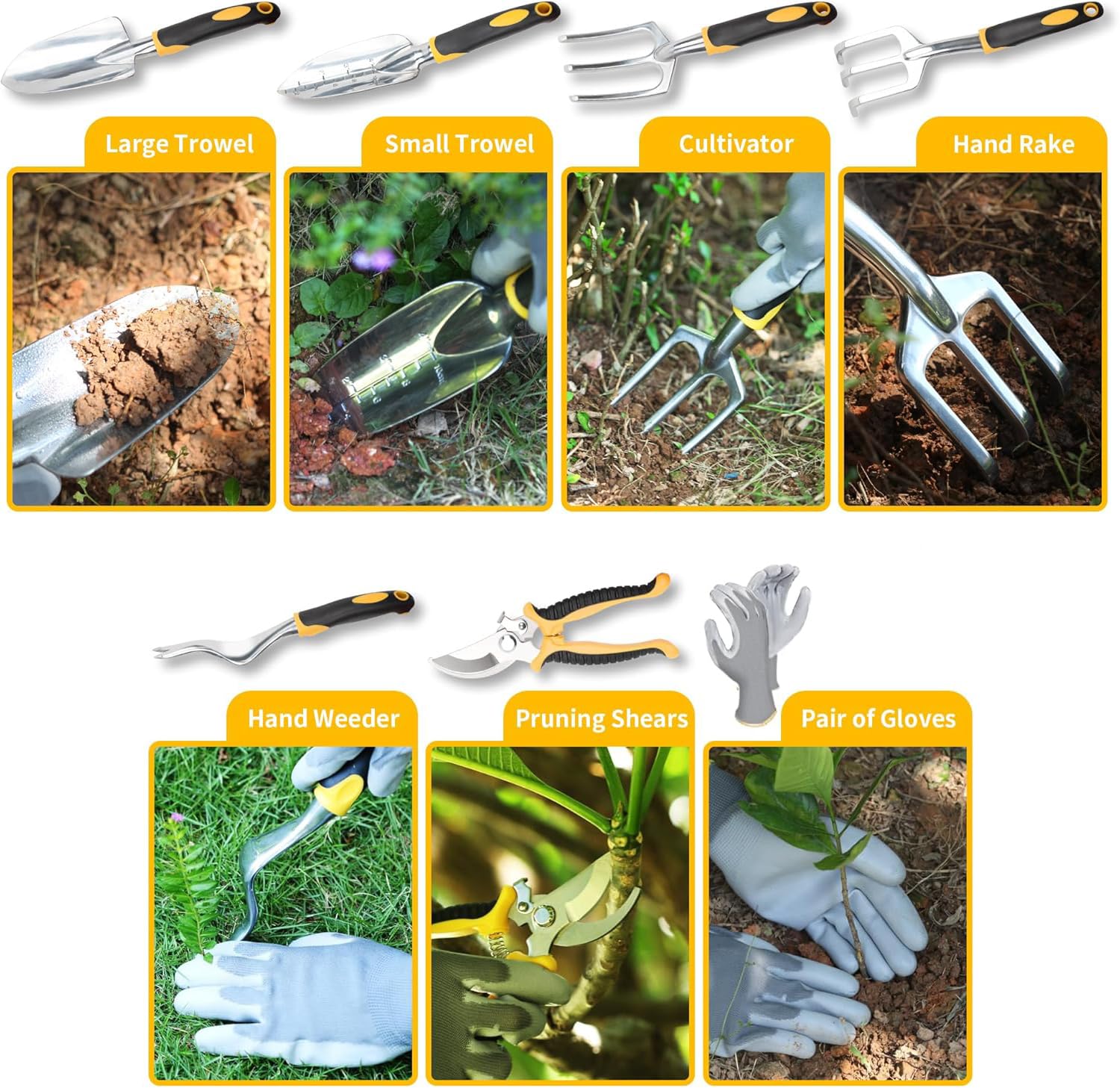 About Garden Tools, 8 Piece Heavy Duty Gardening Tools Set with Non-Slip Rubber Grip, Stainless Steel Garden Tool, Gifts for Kids, Women, Husbands, and Parents