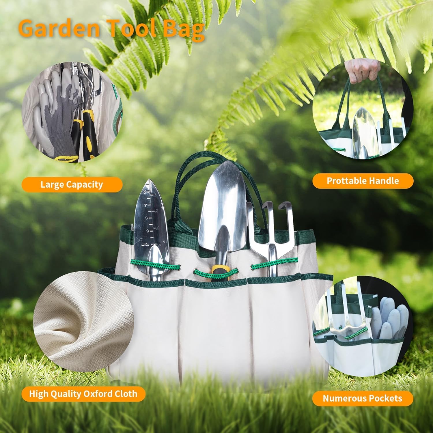 - ใ8 Piece Garden Tool SetใIncluding a pair of gloves, large trowel, small trowel, hand rake, cultivator, weeder, Pruning Shears, tote bag. With this complete set, you’ll have everything you need for a successful gardening experience. Each item in this set is crafted with high-quality materials, ensuring durability and reliability. From preparing the soil to maintaining your plants, our premium garden tools set has got you covered.