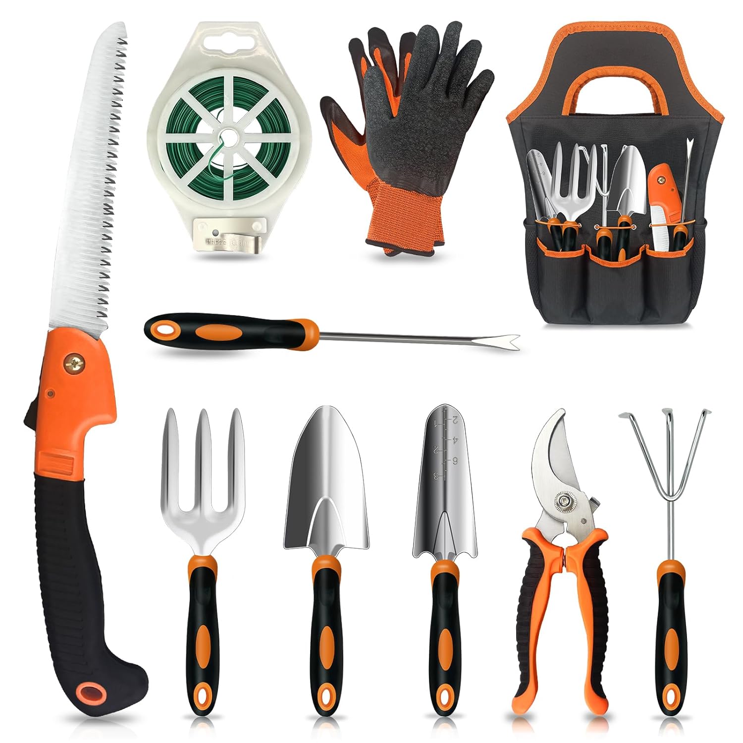 - ใ10 Pieces Premium Gardening toolsใOur 10-in-1 Gardening kit is perfect for your home garden work.This tools mainly includes: garden shears,cultivator,weeder,hand rake,folding saw,large shovel,small shovel,gardening gloves,binding wire and 600D Oxford garden tool organizer.Having such a wide variety of tools can make your willing work more comfortable.