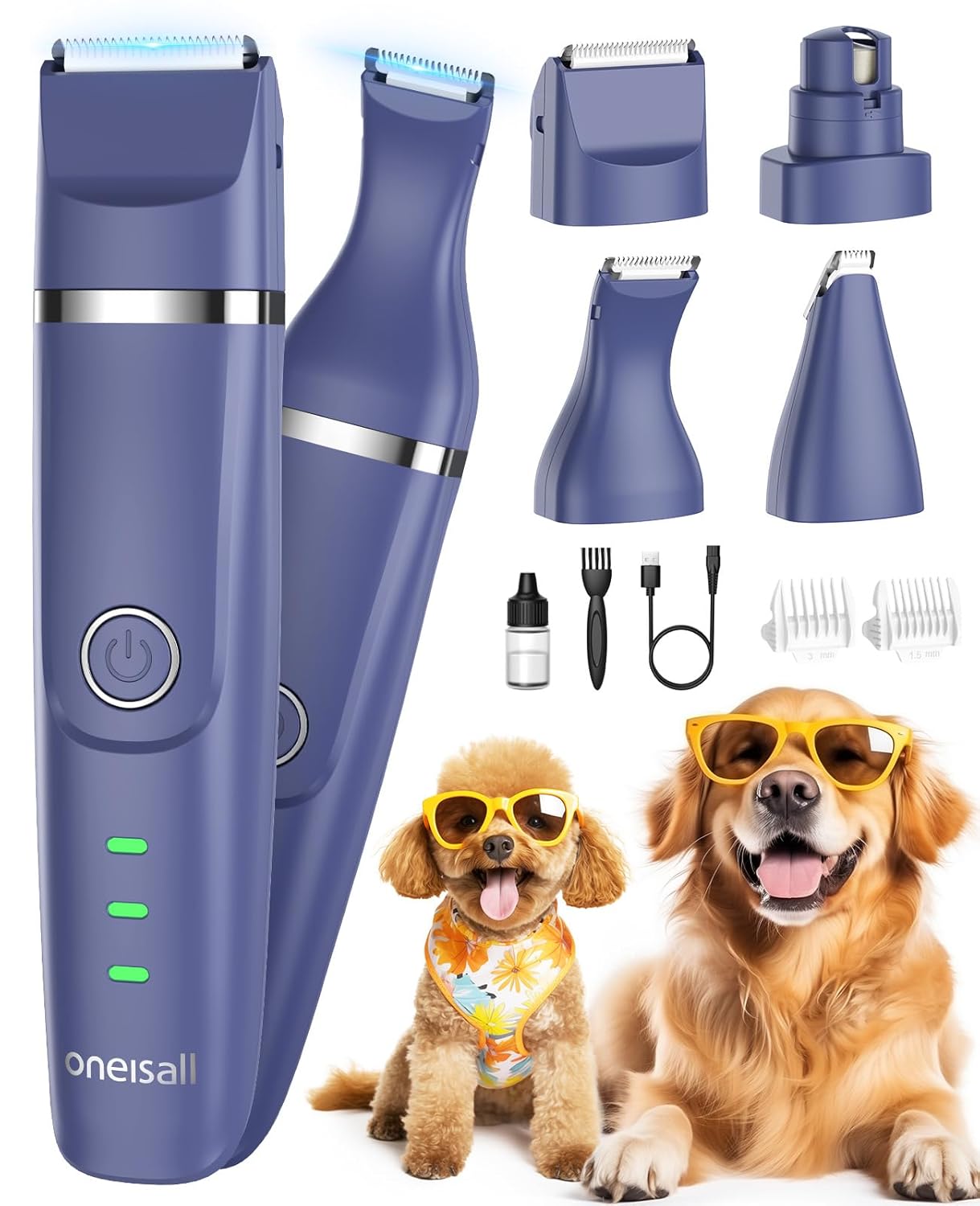 oneisall Dog Clippers & Dog Paw Trimmer 4-in-1 Cordless Grooming Kit: 2-Speed Low Noise Clippers with Rechargeable Quiet Nail Grinder for Dogs & Cats (Blue) by oneisall