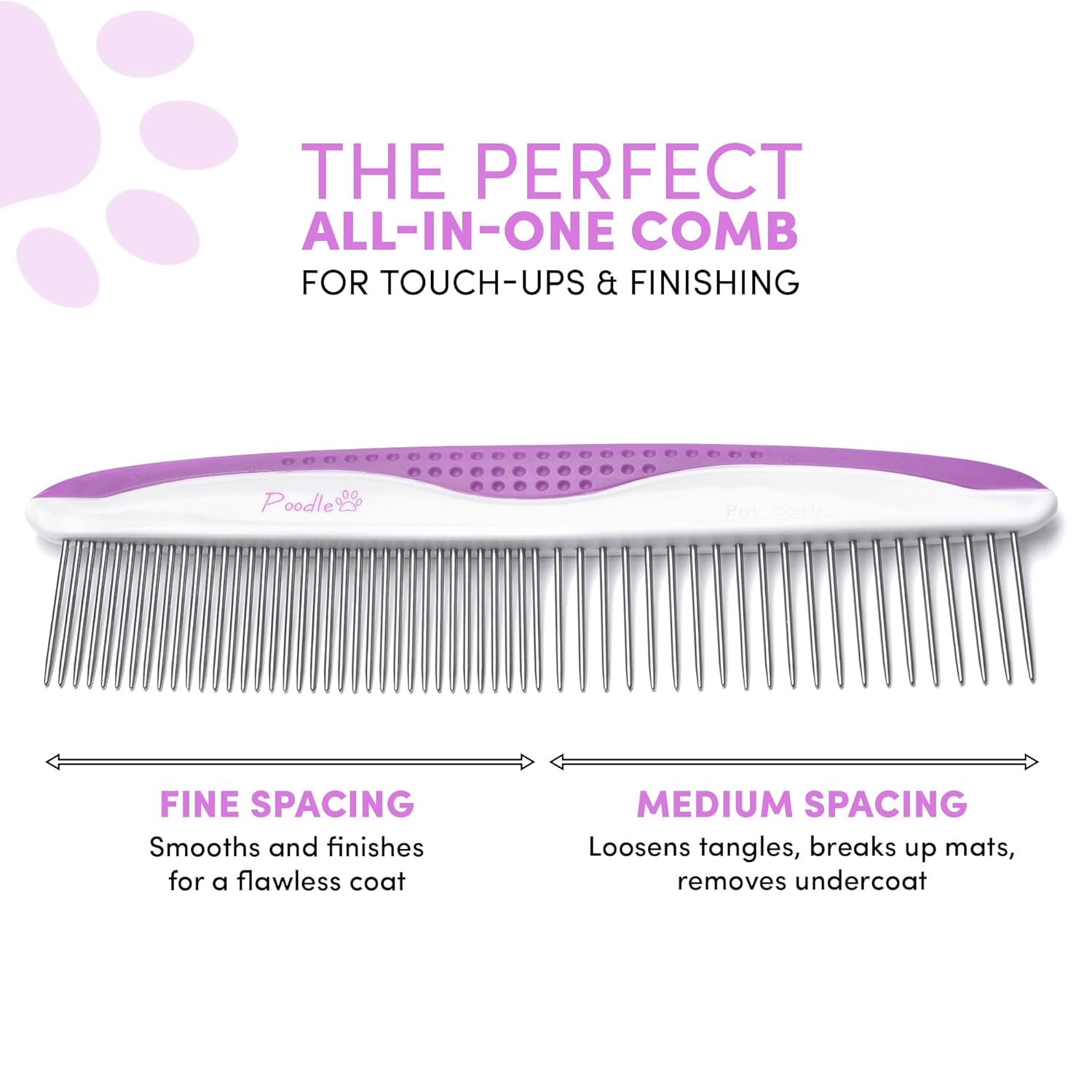 - THE PERFECT ALL-IN-ONE COMB: Combination spacing allows for touching up and finishing your pet’s coat. The spacing is great for breaking up the mat, loosening tangles and removing excess undercoat, while the medium side will remove that mat.