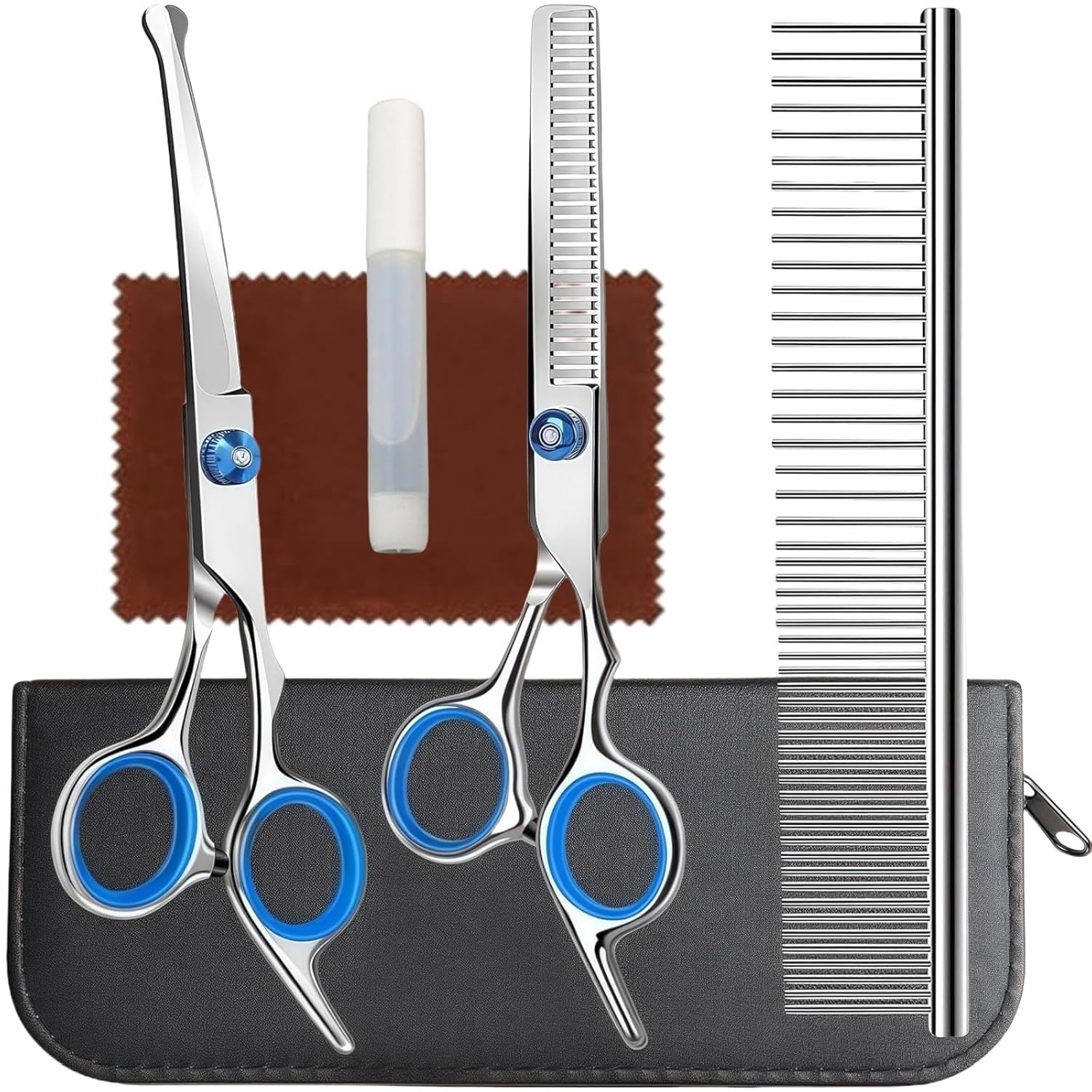 - Complete 4 in 1 Dog Grooming Scissors Kit: Includes 6.5-inch thinning shears, 6.5-inch curved scissors, grooming comb, and a durable storage caseโperfect for both home use and professional groomers.