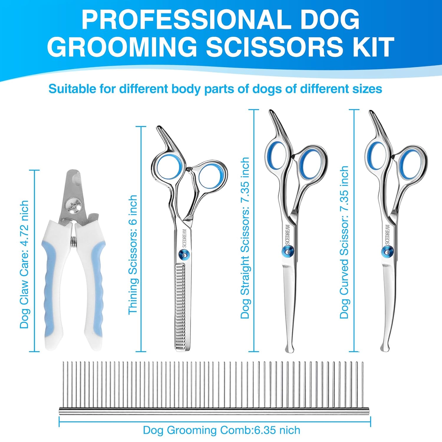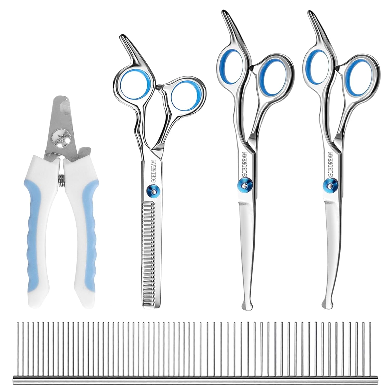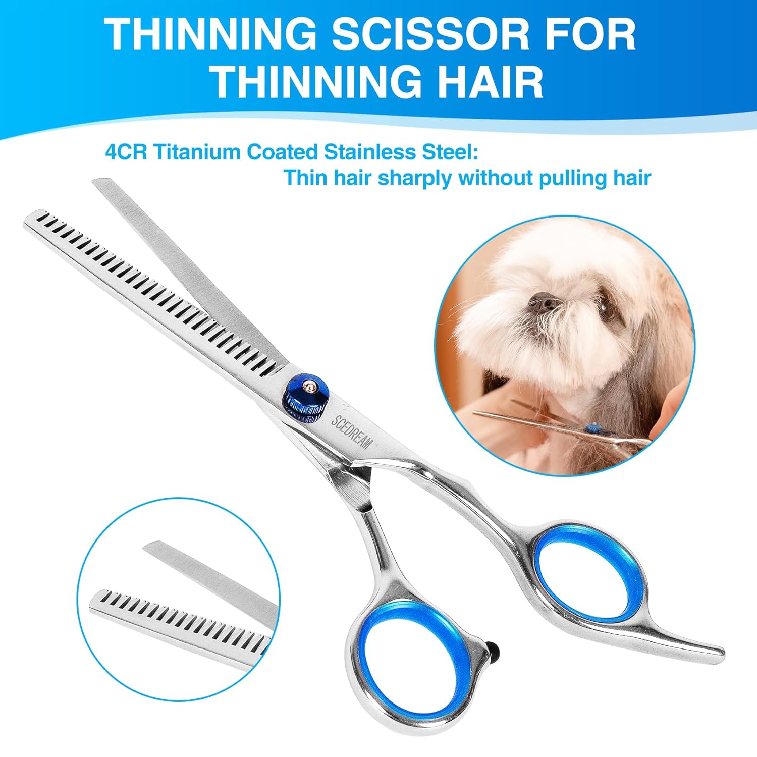- What You Get: SCEDREAM Pet grooming scissors set include 1×6.5″ thinning scissors, 1×6.5″ straight scissors,1x pet comb, 1x waterproof packaging box. Even combs are made of stainless steel. Different dog grooming shears correspond to different pet body parts. Even newbies can skillfully trim a beauty hairstyle for your dog or cat or pet by dog grooming scissors