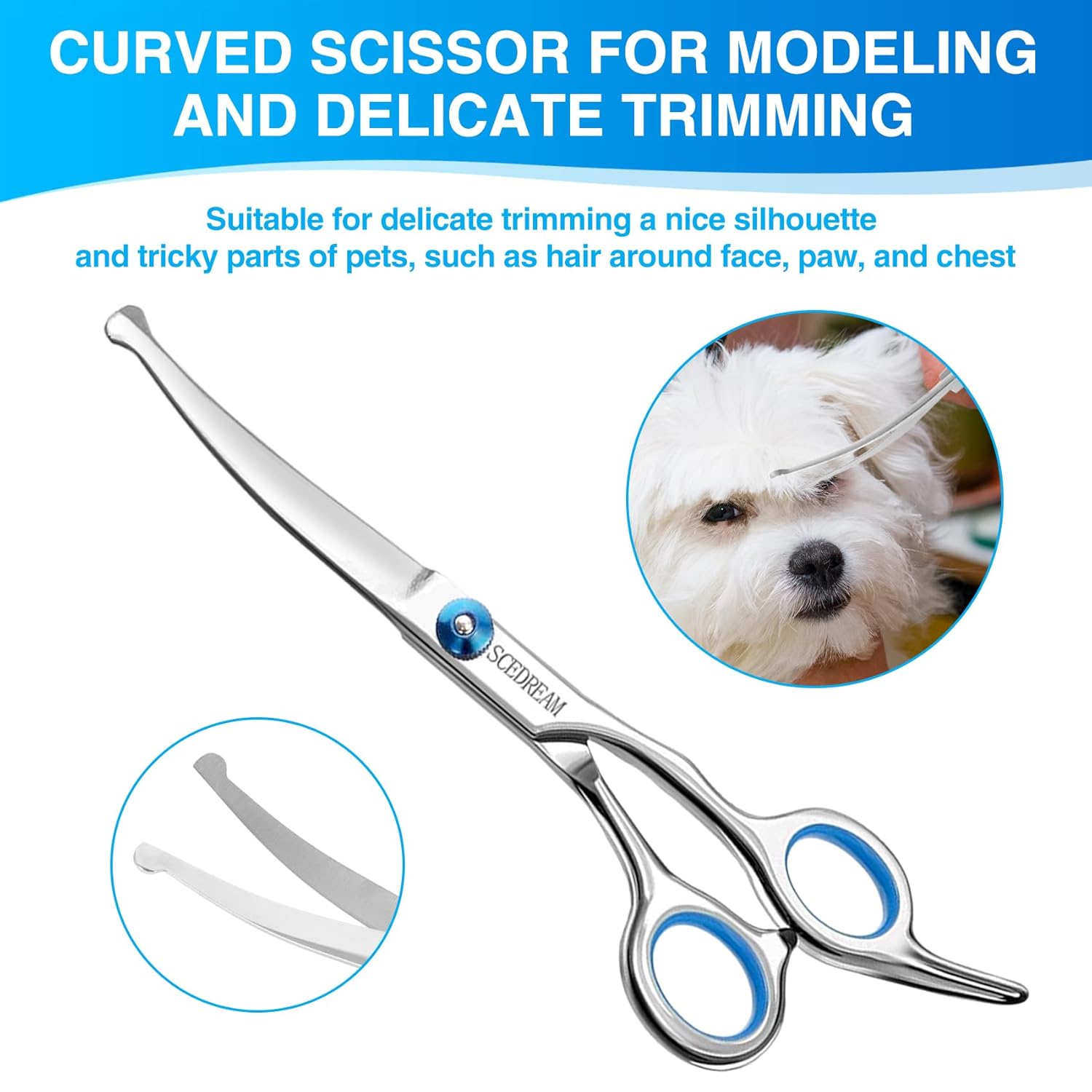 - Why Need a Dog Grooming Scissors Set: The 3 in 1 Pet grooming scissors have a sharper blade and a longer service life, 6.5″ curved shears allow you to cut the hair around your puppy’s eyes and feet pads for x small or small or even a small medium dog,which is more worthy to own for a professional pet groomers or pet lovers
