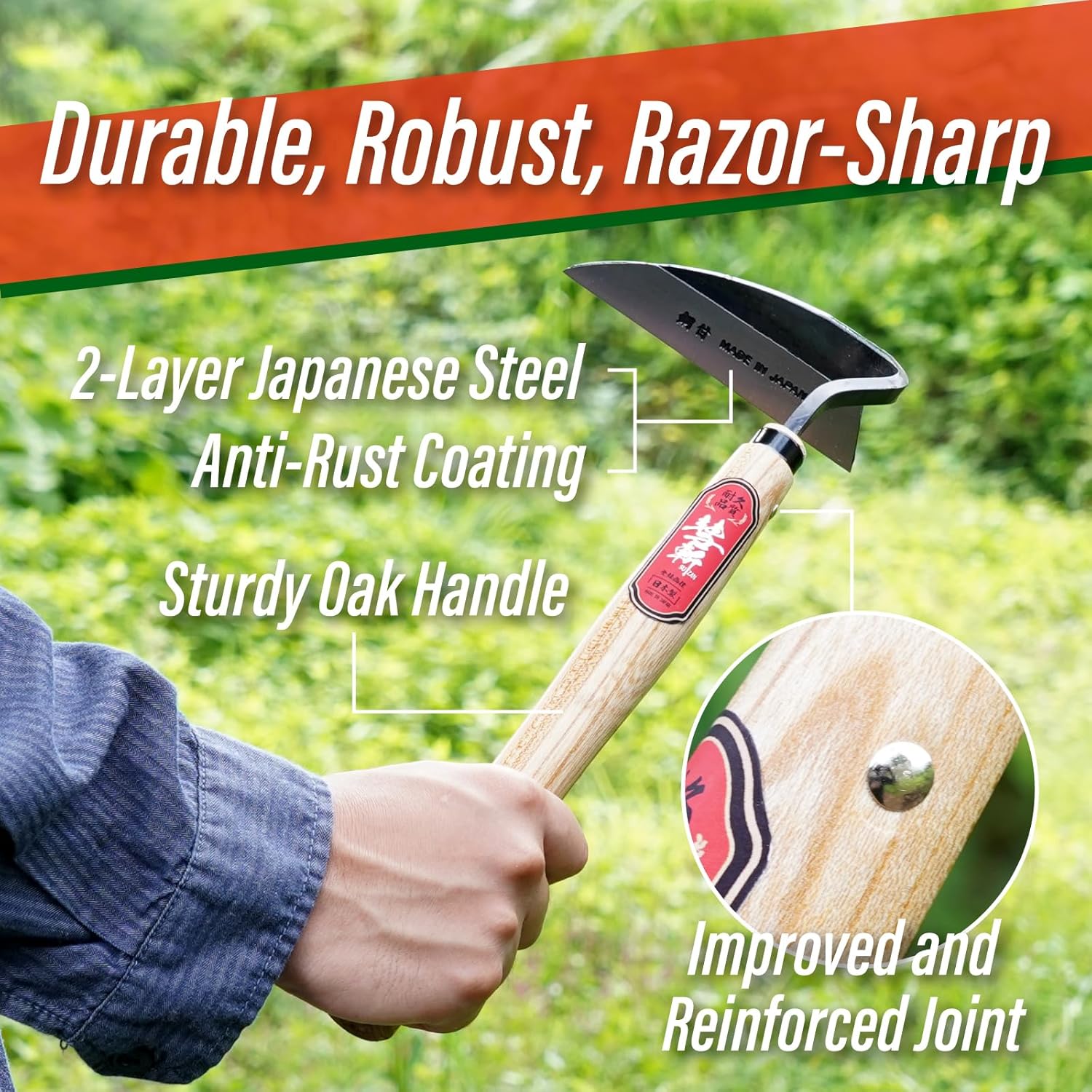 - ใRazor-Sharp BladeใCrafted like a Japanese sword, the high-quality two-layer Japanese carbon steel blade is expertly honed by artisans for outstanding sharpness and durability. It enables swift, precise cuts, removing weeds cleanly from the root with lasting sharpness.