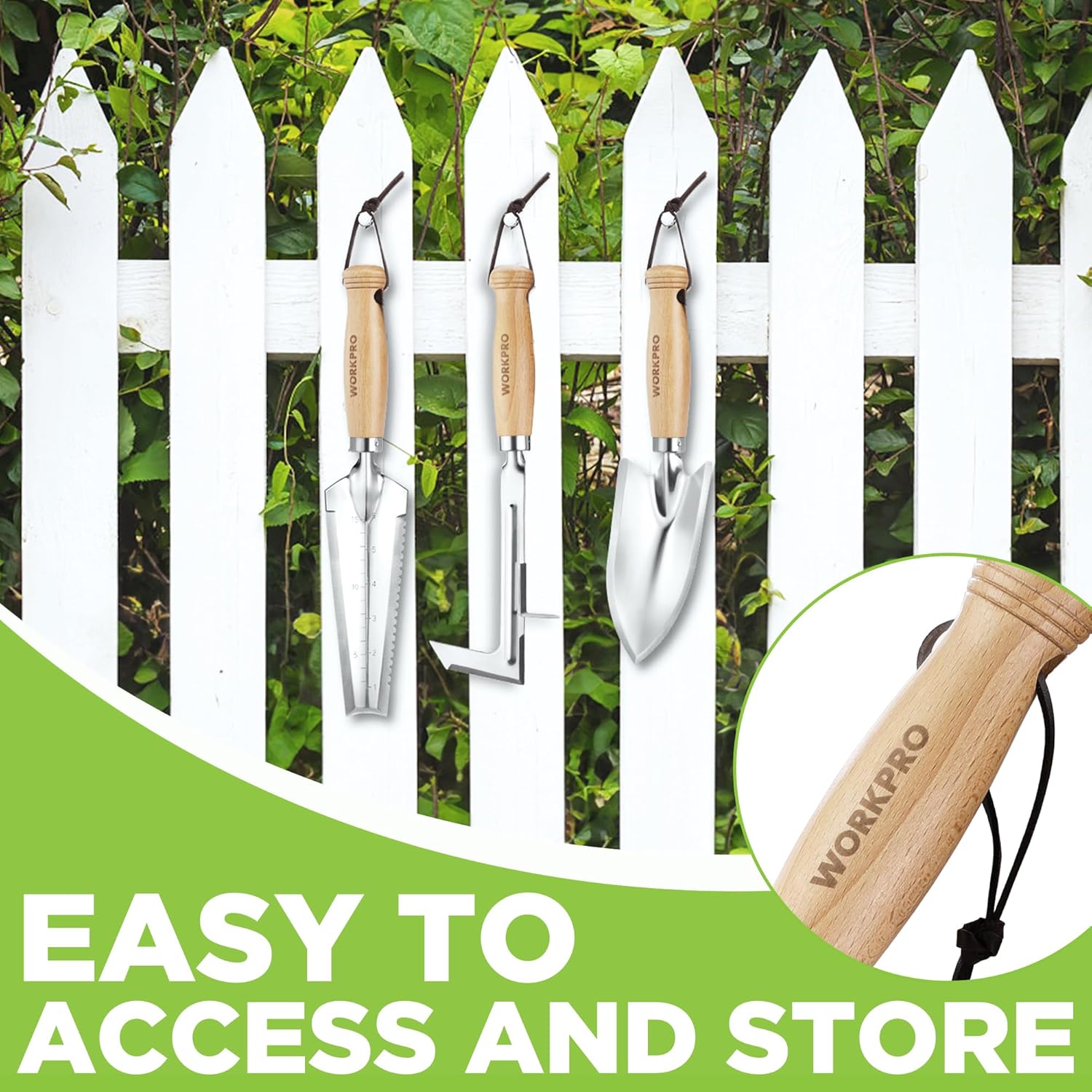 About WORKPRO Garden Tool Set, 3 Pcs Gardening Hand Tools with Wood Handle, Weed Puller, Crack Weeder, Hand Trowel, for Planting, Digging, Weeding, Ideal Gardening for Women & Men