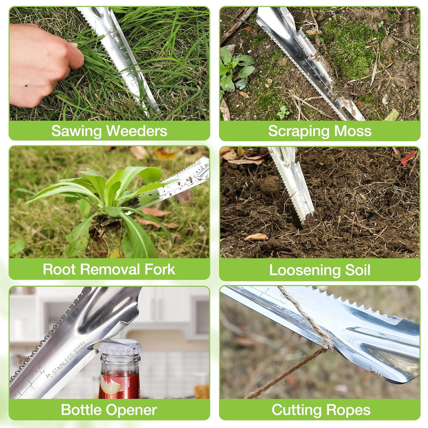 - 5-IN-1 Garden Weeding Trowel: This garden hand weeding tool is specially designed with a fork head. At the front end, can be used for pulling out weeds and deep digging. Serrated & Scraping Blade edges on both sides make weeding out grass and weeds easy. The depth mark ruler is easy to plant and transplant. The cutting notch may also be used to open bottles and cut lines, twine, and plant ties.