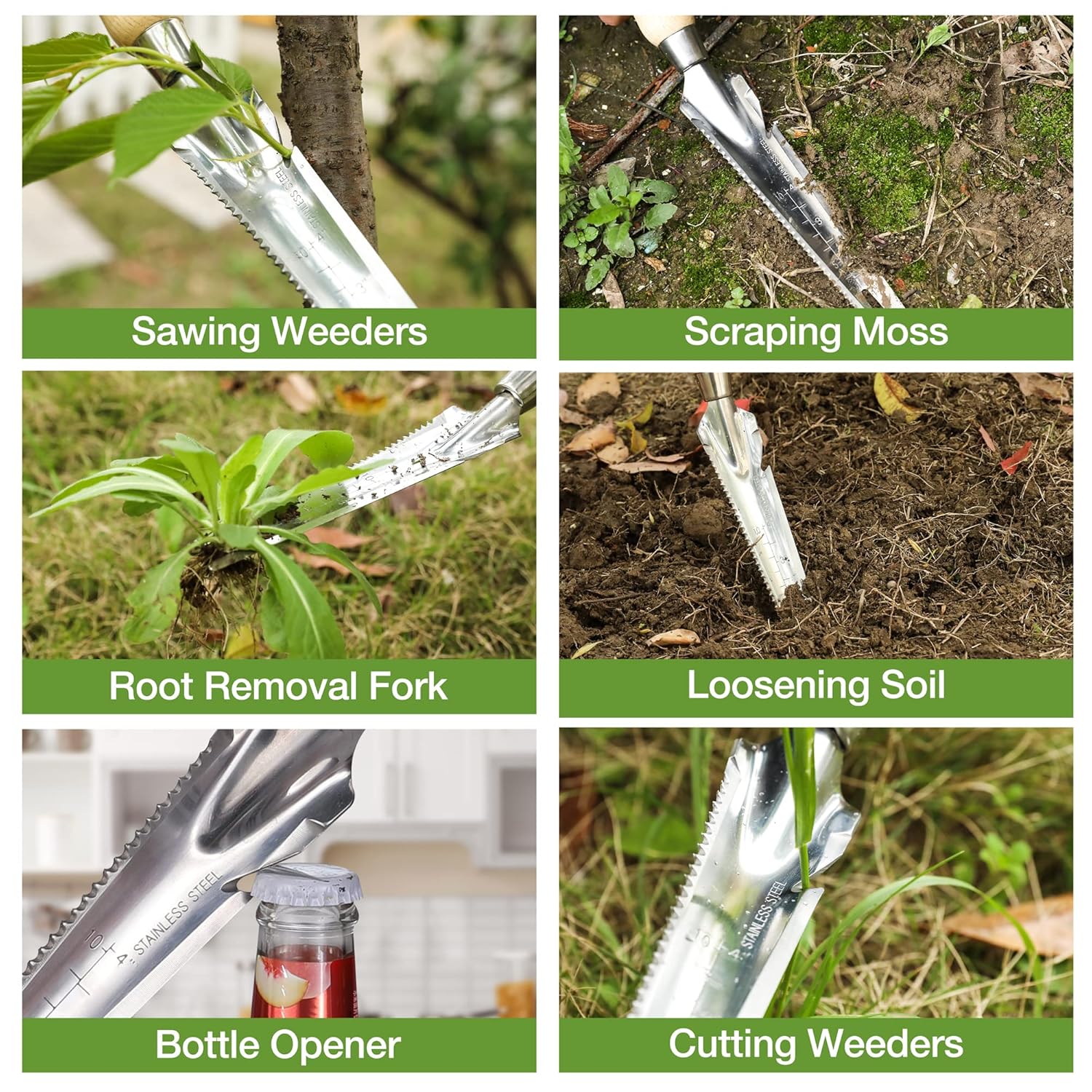 - 5-IN-1 Garden Weeding Trowel: This garden hand weeding tool is specially designed with a fork head. At the front end, can be used for pulling out weeds and deep digging. Serrated and Scraping Blade edges on both sides make weeding out grass and weeds easy. The depth mark ruler is easy to plant and transplant. The cutting notch may also be used to open bottles and cut lines, twine, and plant ties.