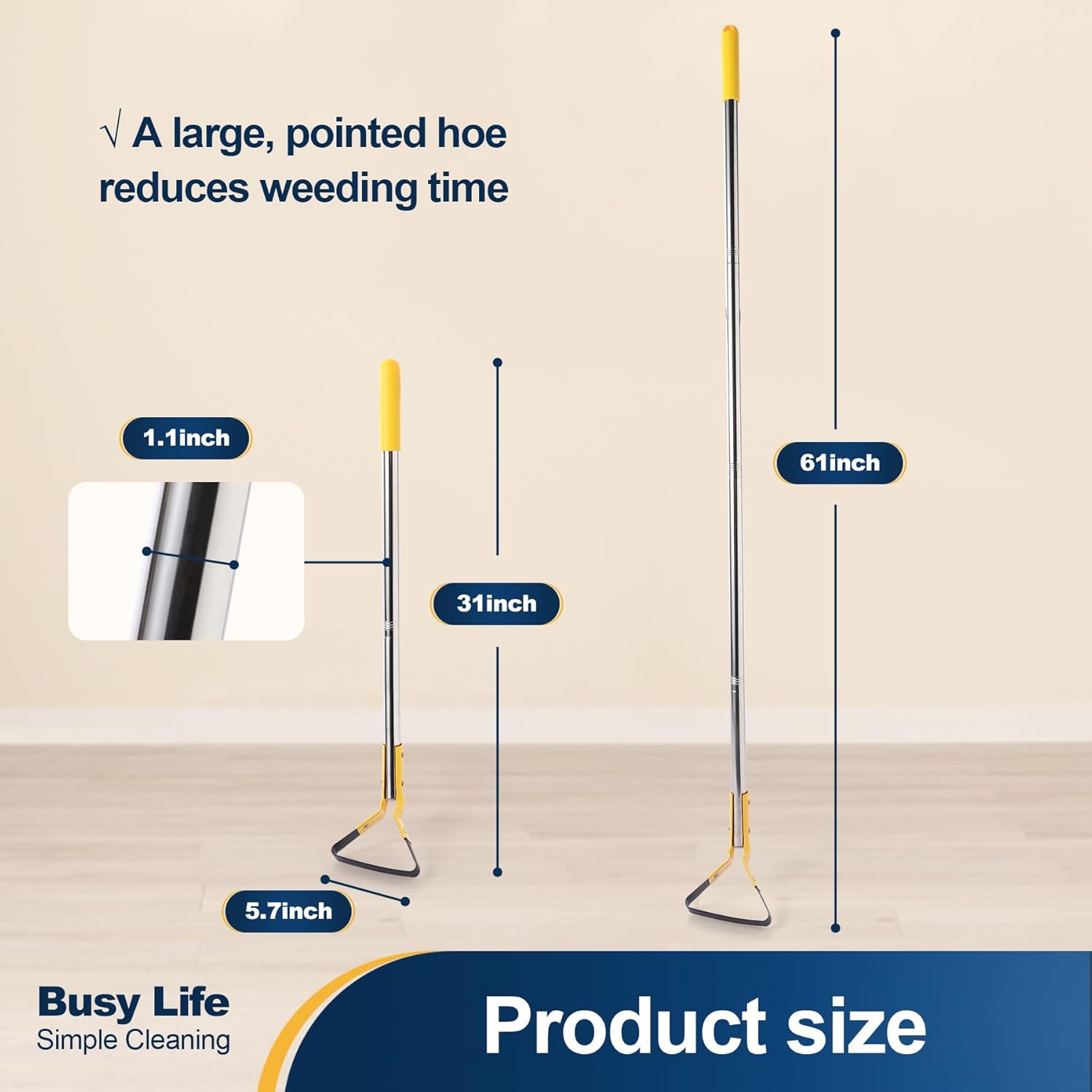 - Hoe Garden Tool Hoe 61” Long Handle Stainless Steel Hoe: Made from extra-thick 1.3″ diameter premium steel, our garden hoes are designed to be sturdy and long-lasting. This good-quality material ensures durability and reliability, making these scuffle hoes a great value for years of use