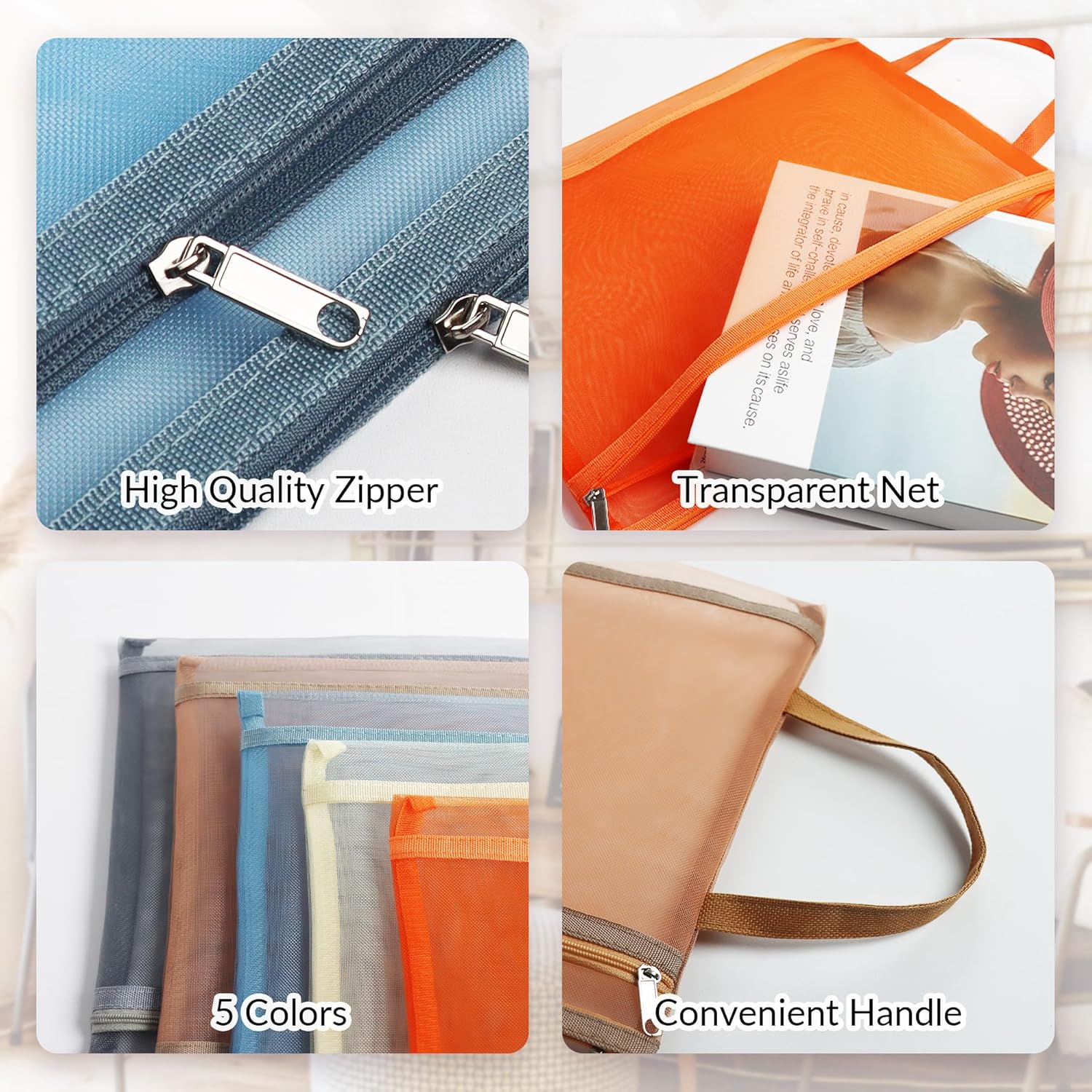 This 10 Pack of Colored Mesh Zipper Pouch Bags are made of high quality materials. They have Handles, and feature a Double-Layer Nylon A4 Mesh with 2 separate storage compartments, and a heavy duty zipper enclosure on each one. You receive 2 pouches of each color. The colors are blue, orange, white, beige/tan, and gray. These offer versatility, functionality, and convenience.