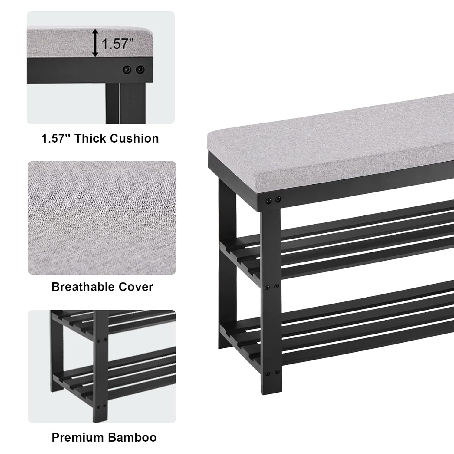 About Apicizon 3-Tier Shoe Rack for Entryway, Bamboo Shoe Bench with Cushion Padded Seat, Small Shoe Organizer with Storage for Indoor Entrance Hallway Bedroom Living Room, Black