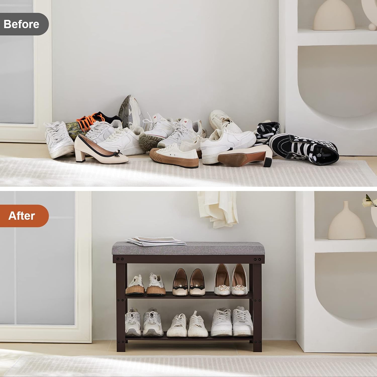 About Apicizon 3-Tier Shoe Rack for Entryway, Bamboo Shoe Bench with Cushion Padded Seat, Small Shoe Organizer with Storage for Indoor Entrance Hallway Bedroom Living Room, Brown