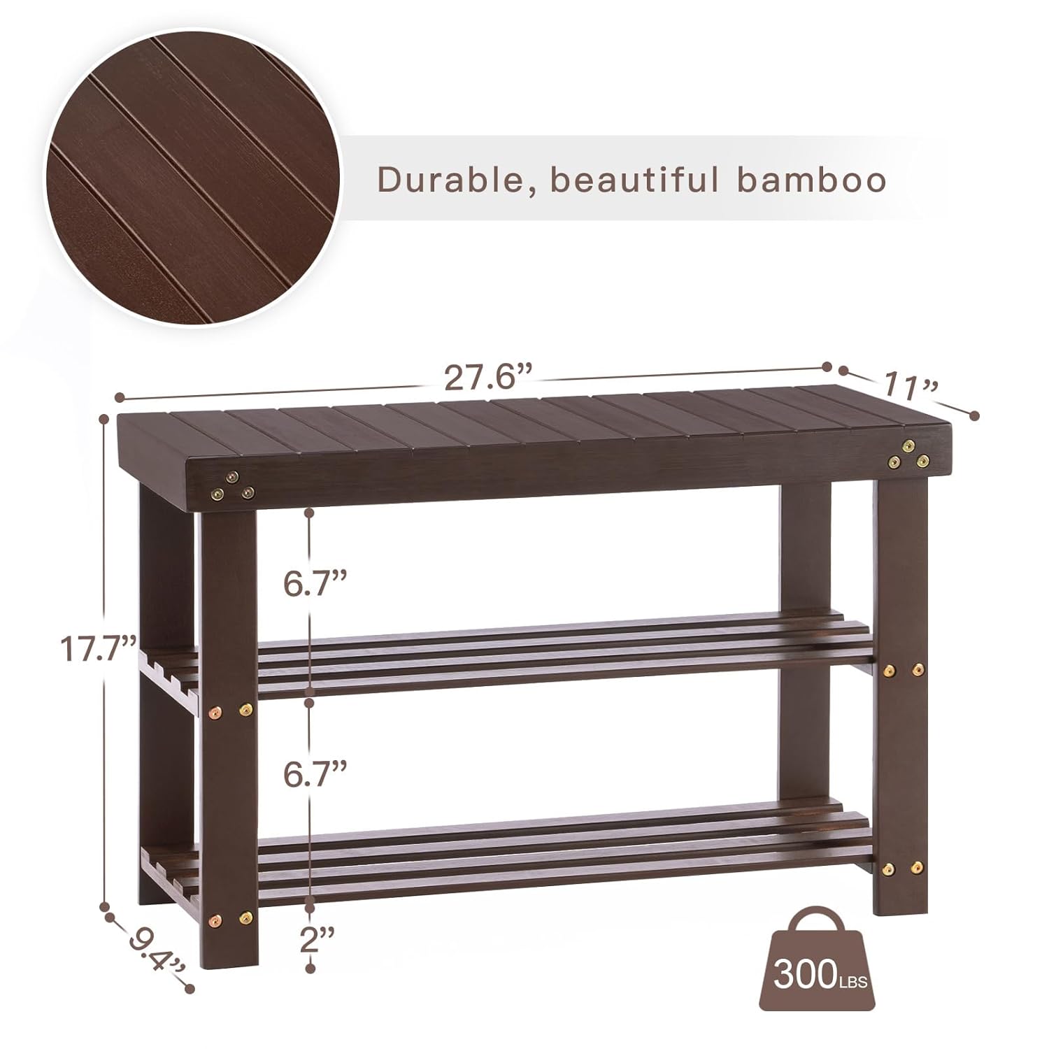 - STABLE STRUCTURE- The shoe bench is made of 100% natural bamboo can hold up an impressive 300lbs. Smooth edges and sunken screws prevent snagging.