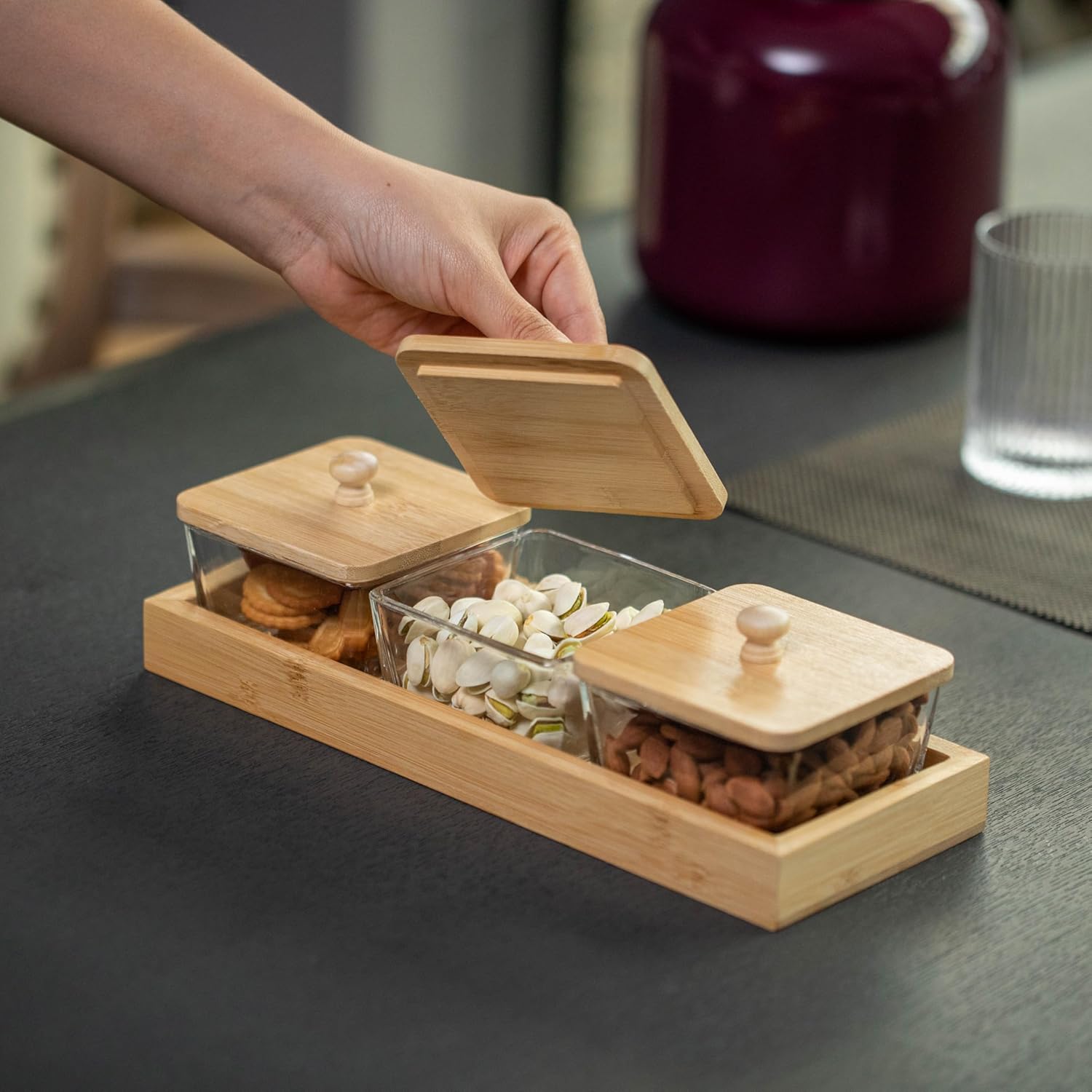 - Enhance your home decor and kitchen organization with this stylish tray of snack containers, crafted from high-quality glass and bamboo wood. Designed for durability and longevity, these sturdy containers feature bamboo lids that keep your snacks fresh while adding an elegant touch to your coffee table or kitchen pantry.