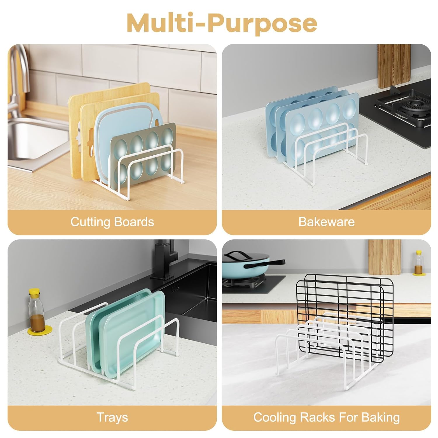 - 🎁【Neat and Hygienic】The cookie sheet storage can be used to store cutting boards, cookie sheets, trays, bakeware, keep them organized and keep your kitchen tidy and organized. In addition, the cutting board storage rack can also help the cutting board to drain water and avoid nourishing bacteria.