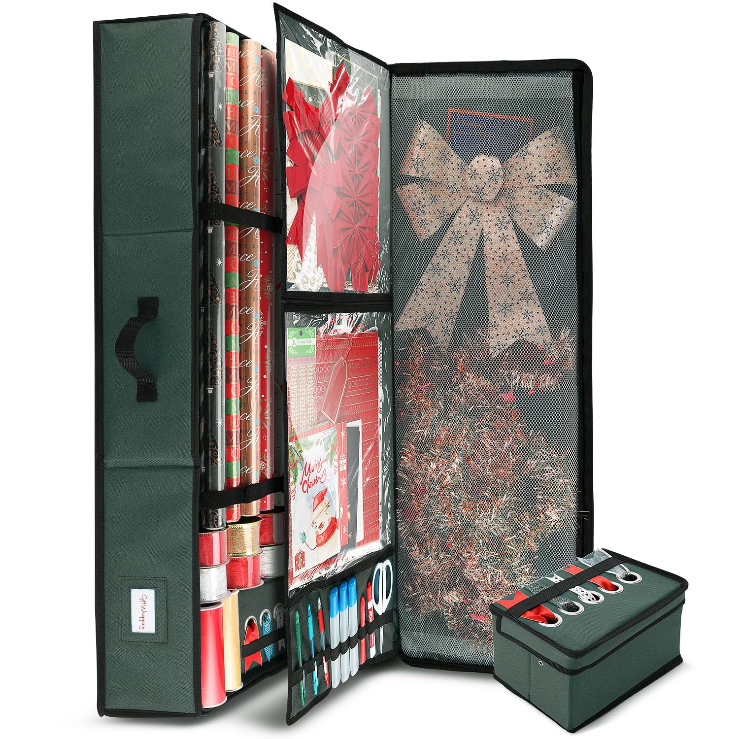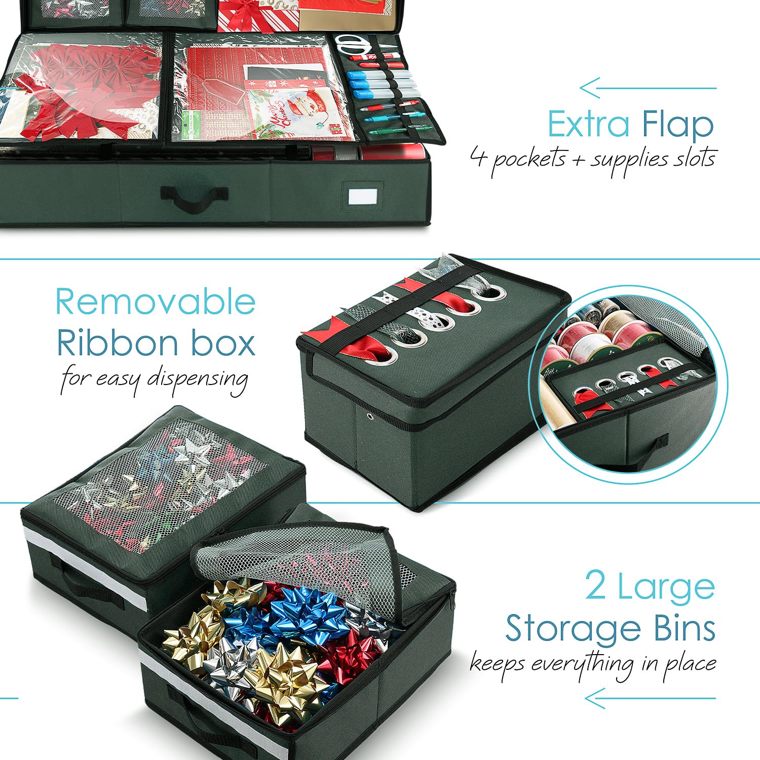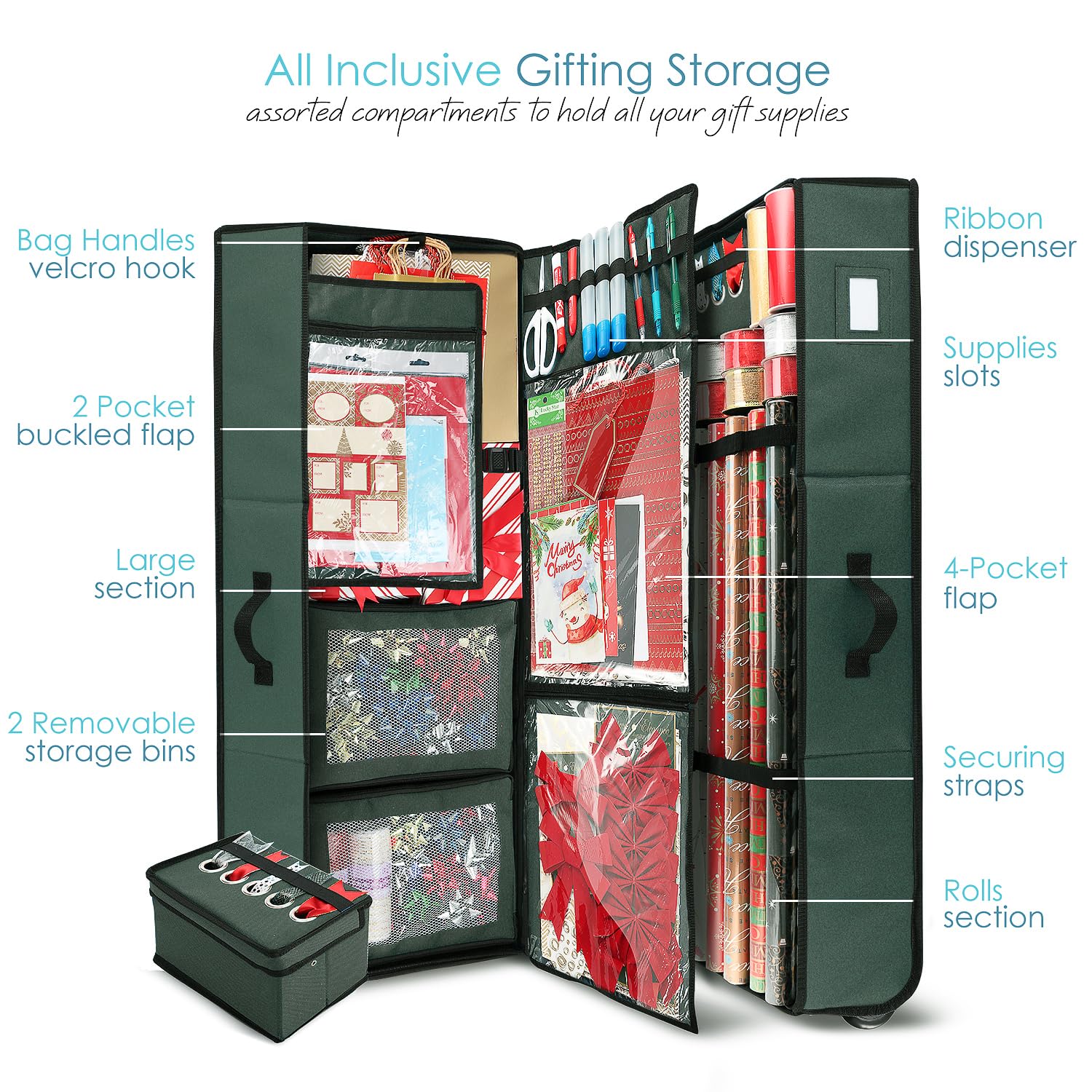 - EZ Gift Wrap Storage – the ultimate christmas wrapping paper storage containers for wrapping paper and supplies! with our top-rated new design wrapping paper storage box on wheels you get the best choice to keep your gift wrap neat with less waste! Keeps your wrapping paper rolls, ribbons, gift bags, supplies protected & organized, in one place!