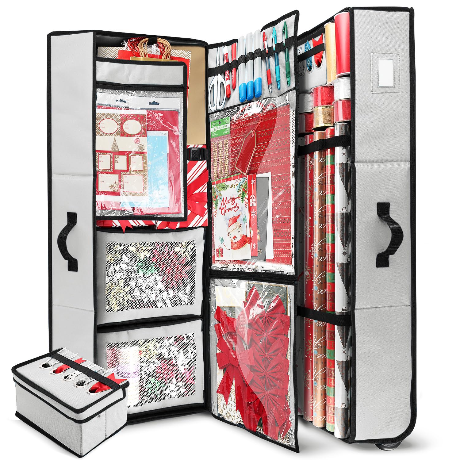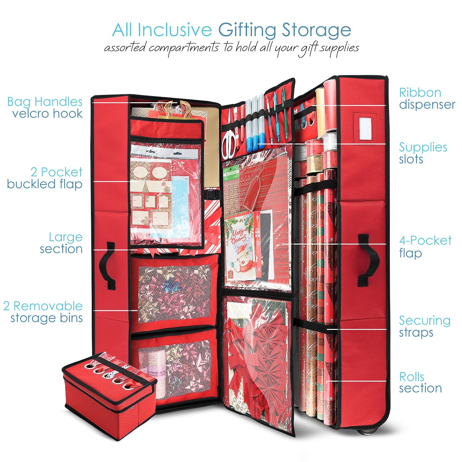 - EZ Gift Wrap Storage – the ultimate christmas wrapping paper storage containers for wrapping paper and supplies! with our top-rated new design wrapping paper storage box on wheels you get the best choice to keep your gift wrap neat with less waste! Keeps your wrapping paper rolls, ribbons, gift bags, supplies protected & organized, in one place!