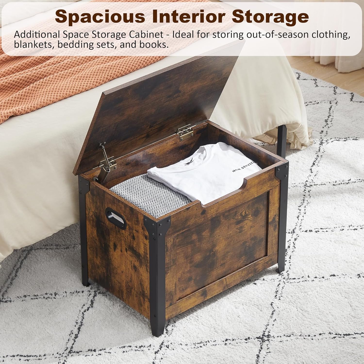 - ใSafety-Enhanced DesignใThis storage trunk chest features safety-engineered dual hinges that prevent sudden lid closure, ensuring user protection. The front U-cut design offers quick access to stored items, while side ventilation handles enable easy portability to any desired location.