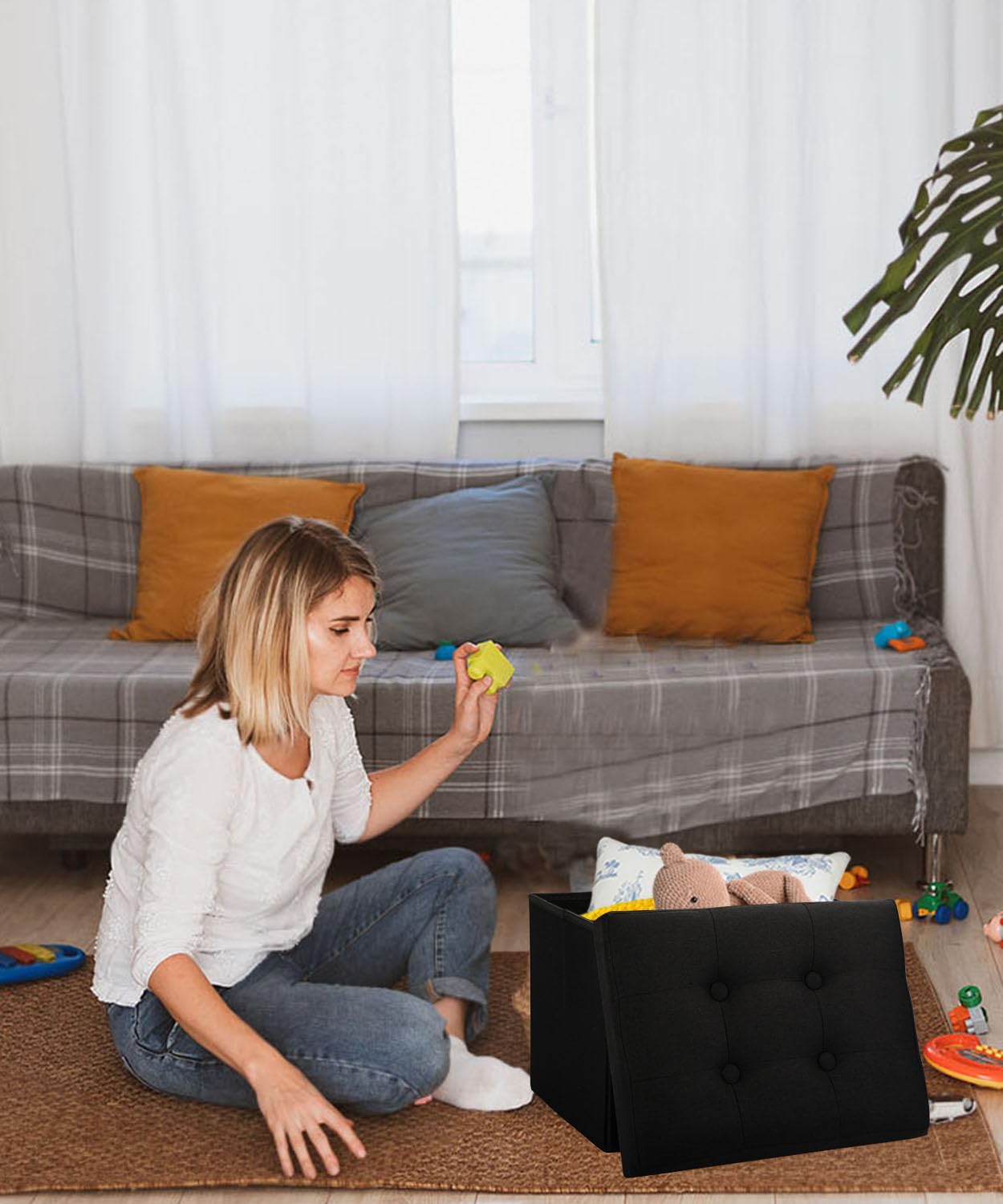 We got this folding storage ottoman for the living room, and it’s been a great solution since we got rid of our old shoe rack bench. The kids mostly use it to sit down and put their shoes on, and it’s the perfect height for them. It’s surprisingly sturdy and holds up well, even with my husband and I sitting on it.