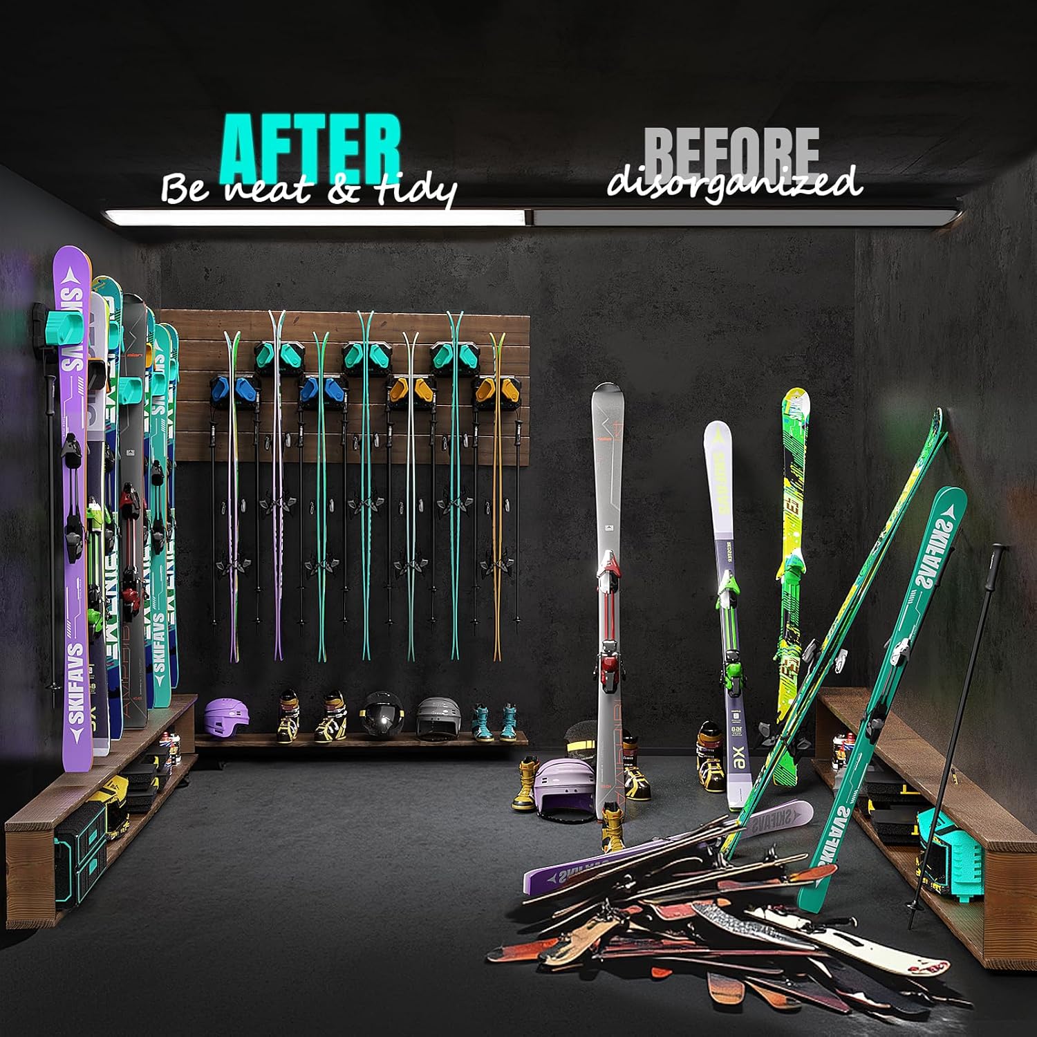 - Versatile and Stylish: Our ski holder isn’t limited to just skis. It can accommodate any skis, snowboards and skateboards. Its multifunctional design also allows you to hang brooms, sleds, and other tools. With its staggered arrangement, our ski wall mount not only provides efficient storage but also adds a touch of elegance to your room, transforming it into a stylish winter sports haven.