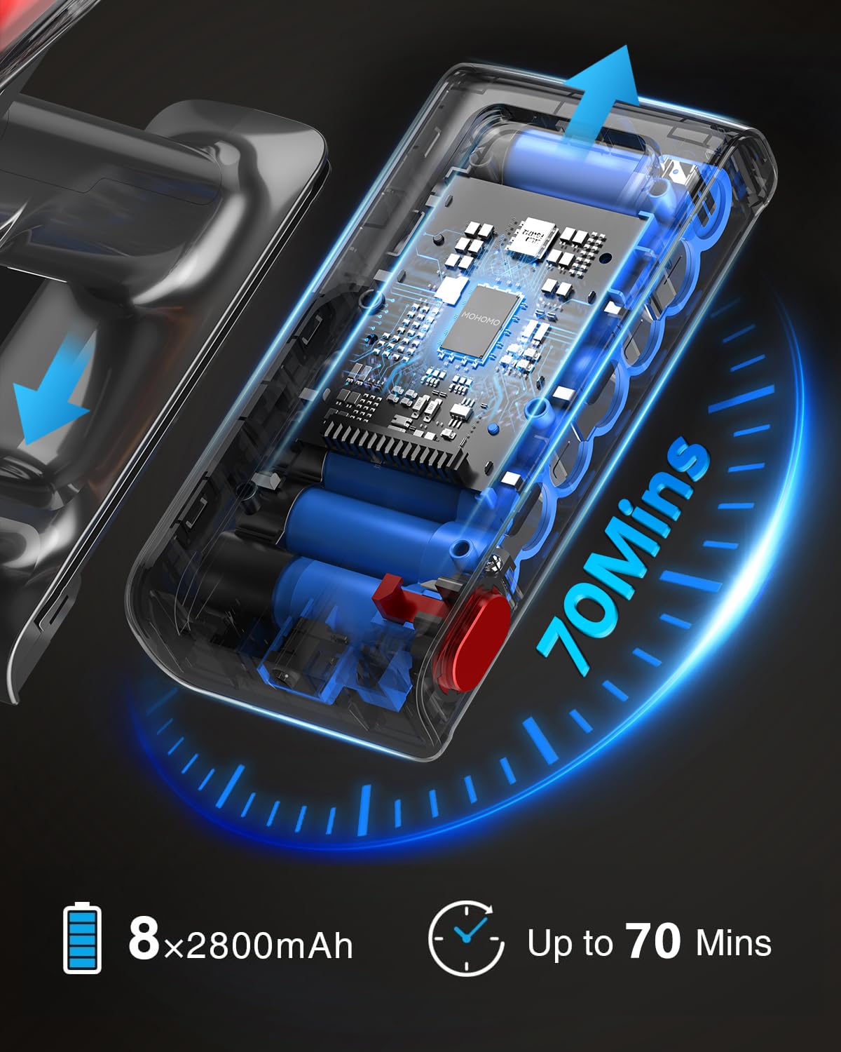 - ➤【 Max 70-min Battery Life & Self-standing Design 】This cordless vacuum cleaner is powered by 8×2800 mAh high-capacity lithium-ion batteries, which radically extends battery runtime. When fully charged (4 hours), the stick vacuum can operate for 20 mins in max suction mode and up to 70 mins in min suction mode. The stick vacuum has a self-standing design that makes it easy to store and recharge for added convenience(Please use MOHOMO’s power adapter to charge the battery). Ideal for ‘cleaning the whole house’. A second battery is available for purchase in stores.